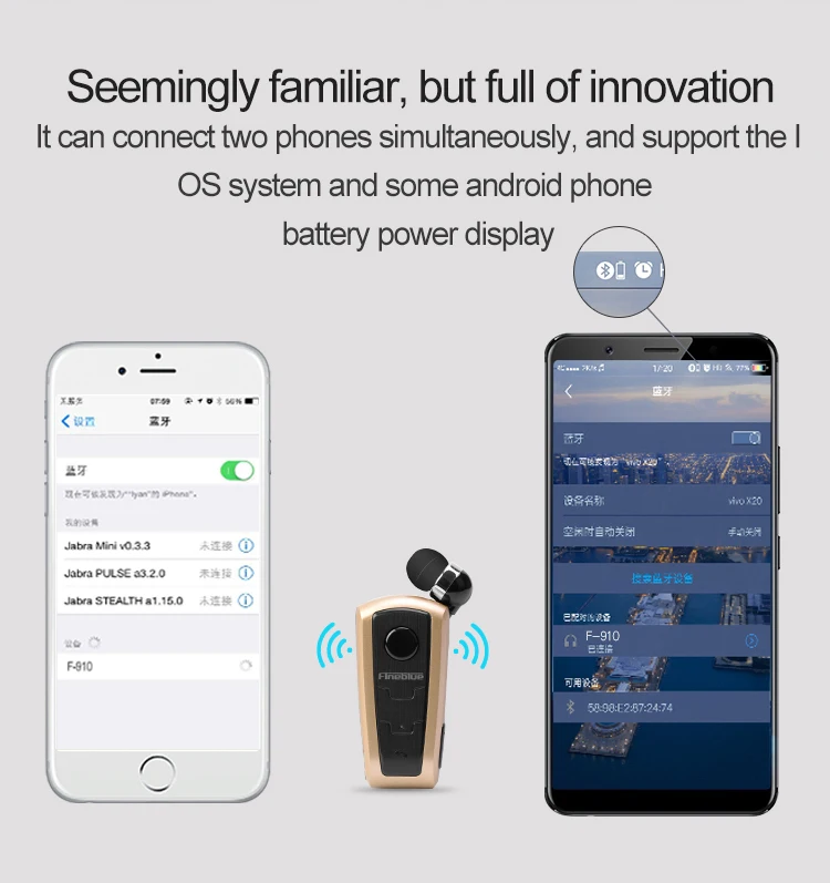 Elevate your communication experience with the Fineblue F910 Portable Wireless Bluetooth Earphone Headset. Perfect for on-the-go professionals, this sleek and stylish headset offers a seamless hands-free calling solution. Its compact design and retractable feature make it easy to carry and use wherever you are. With in-ear vibration reminders, you'll never miss an important call or notification again. Ideal for sports and running, this headset comes with a secure wear clip for added convenience. Stay connected, stay productive with the Fineblue F910 Wireless Bluetooth Earphone Headset. Order now and enjoy fast shipping within 48 hours.