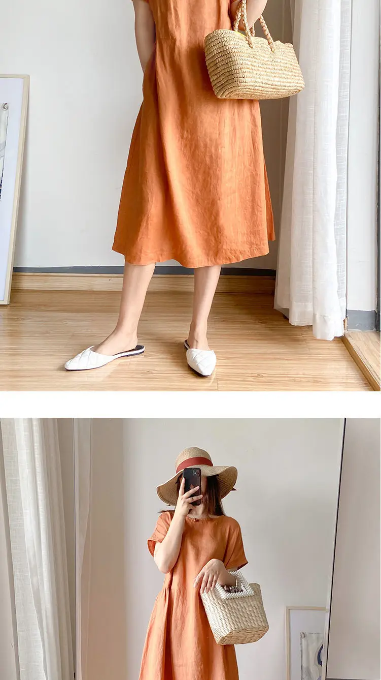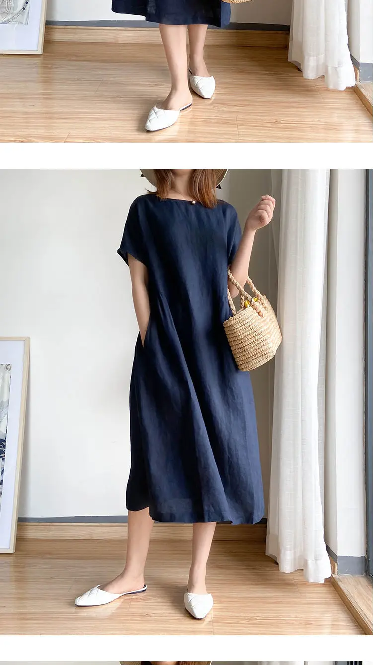 Short Sleeve Dresses Womens Solid Simple M-4XL Retro Cotton Breathable Leisure Loose Mid-calf Vestidos Daily Ladies All-match