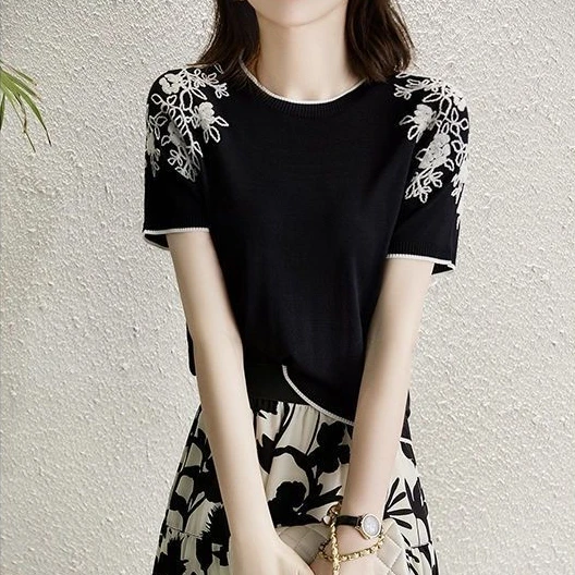 Short Sleeve T-shirts Women Comfortable Fashion Chic Summer Embroidery Design Female Casual Elegant Retro All-match Harajuku New