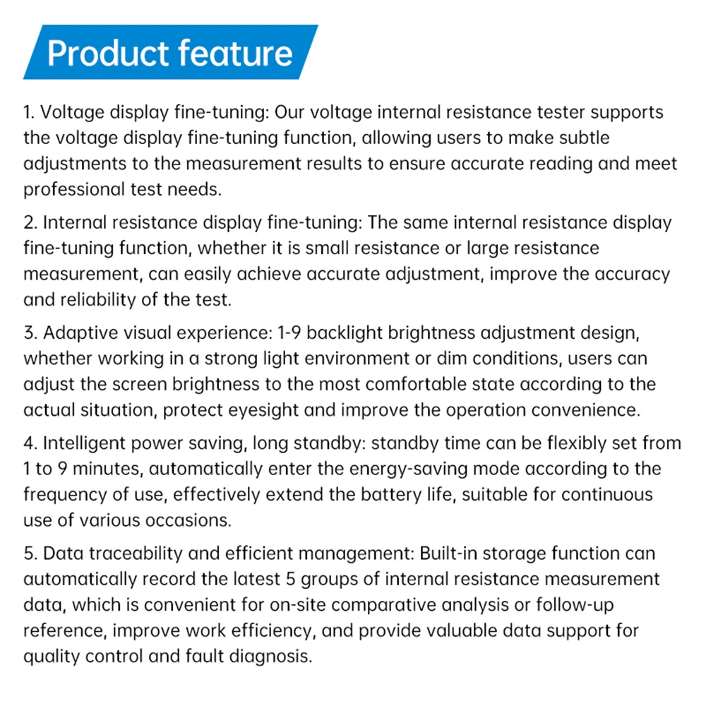 Ts457 4 Line Method Dc5v Battery Voltage Internal Resistance Tester- Battery Voltage Tester/digital Battery AnalyzerFeatures:Voltage test range: 0.001V~45.00V Maximum resolution 0.001VInternal resistance measurement range: 0.1mΩ~6.999Ω Maximum resolution 0.1mΩData Recording: Support to record 5 groups of internal resistance measurement data.Auto Power Off: Support 1~9 minutes standby time adjustment.Backlight Brightness: Support 1~9 levels of display backlight brightness adjustment.