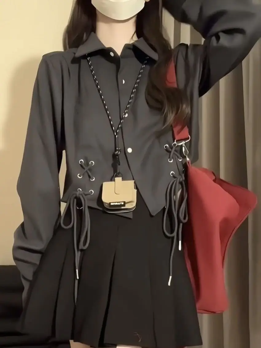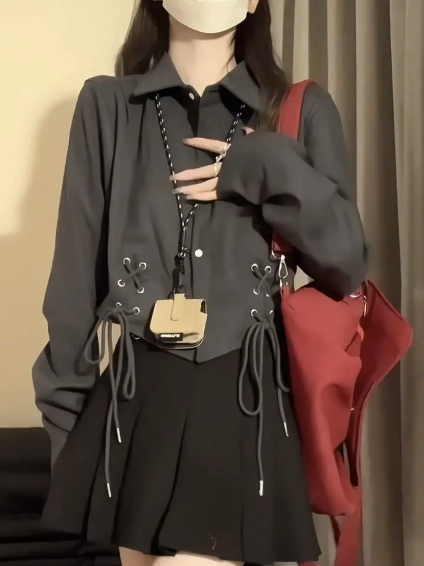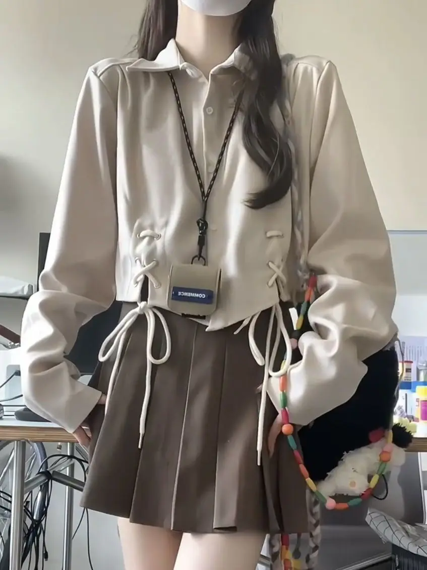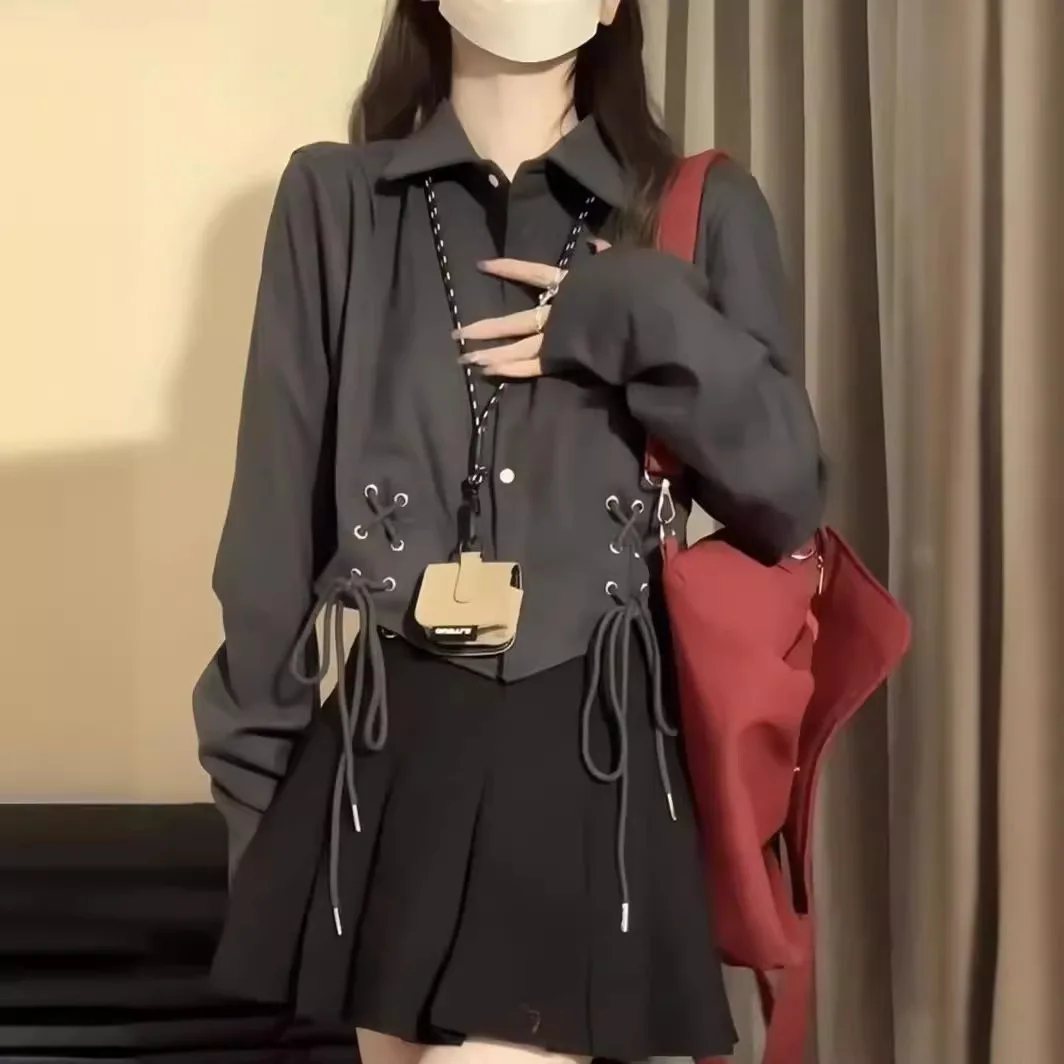 Long Sleeve Shirts Women Japanese Style Sweet Spicy Girls College Bows Lace Up Solid Autumn Winter Loose Single Breasted Fashion