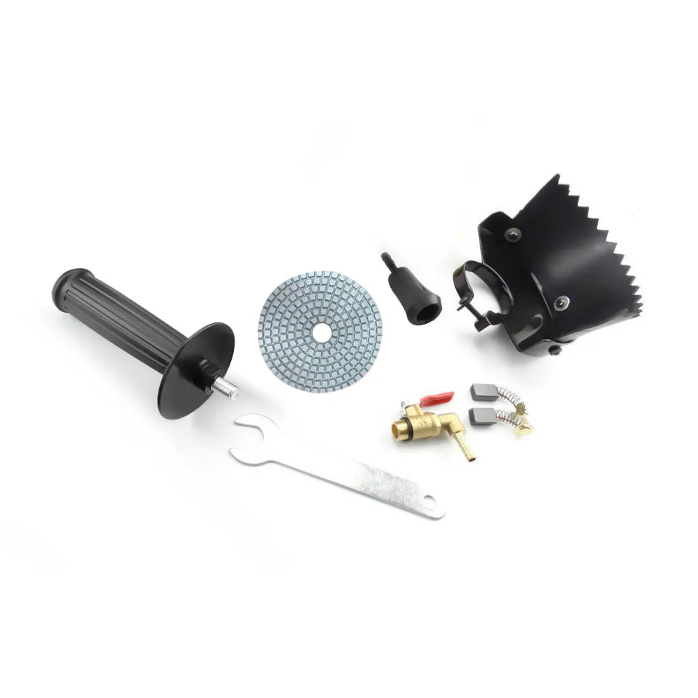 1.Polishing discs (The wet stone grinder has been specially developed for professional use in stone processing in stonemasons and craftsmen. The wet stone grinder has been designed for powerful wet grinding and wet polishing of granite, marble and other types of rock. The wet stone grinder impresses with its enormous load limit and its robustness. The 1400 Watt engine never lets you stand in the rain and offers you constant performance – no matter what the task. The double undercarriage gearbox of the wet stone grinder has been designed for continuous use and offers you a particularly high abrasion performance.