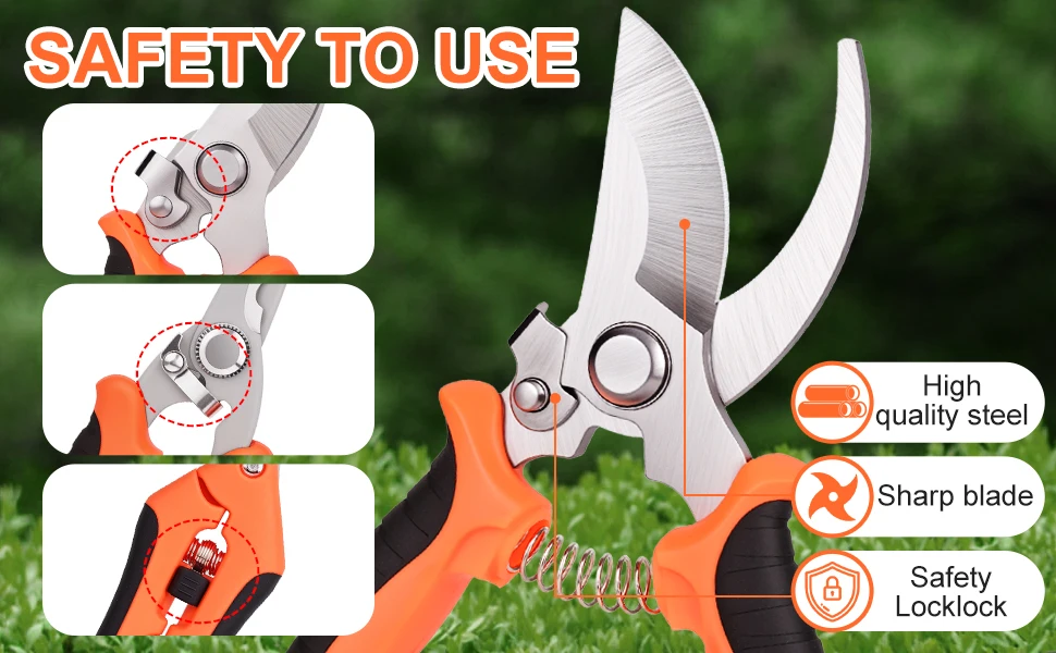 【Secure & Easy To Lock】Our garden shears feature a safe and secure sideways locking mechanism that keeps your blades protected and closed when not in use, and can effectively reduce accidental injuries. The design of these branch cutter are perfect to use whether you are right or left handed with ease. Hand Pruners Shears Branch Cutter Hand Pruners Garden Clippers Handheld Plant Scissors Garden Pruners Flower Cutter Flower Shears Garden Snips Garden Pruning Shears Plant Clippers.