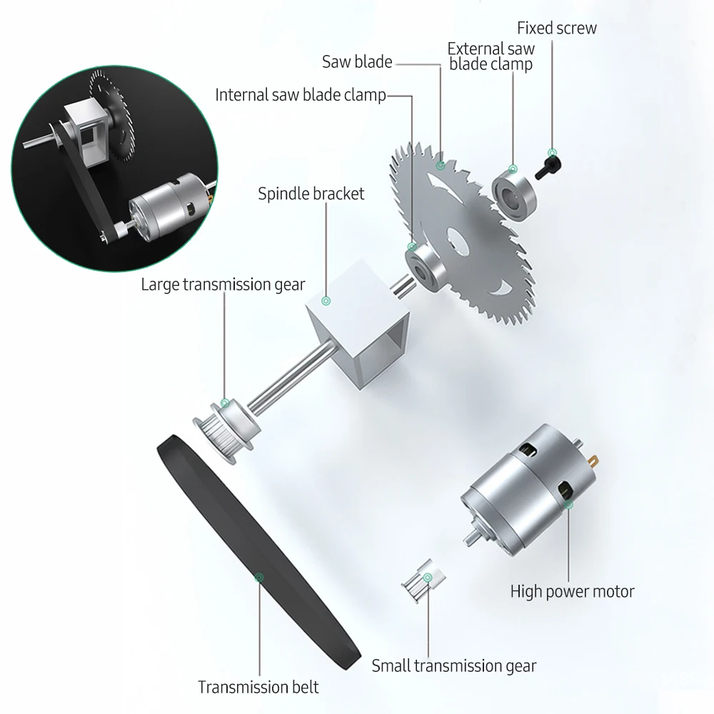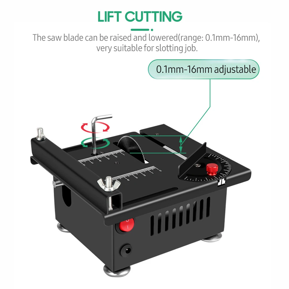 Mini table saw, space-saving, convenient to anywhere, made of high-grade metal & good electronic parts, long lasting, well-performed.