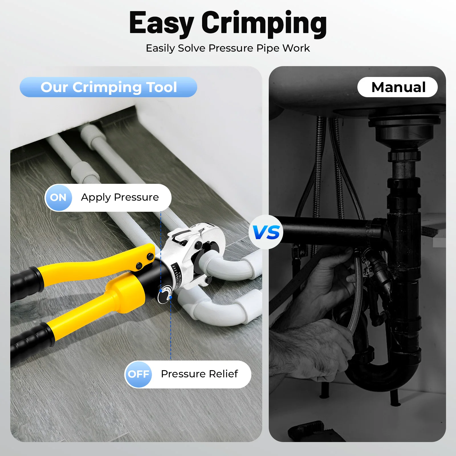 Easy Crimping: Unlike similar manual tools that rely on leverage and hand power, our crimping tool is designed with a hydraulic cylinder that saves labor, making it sufficient for you to make leak-free connections all by yourself.