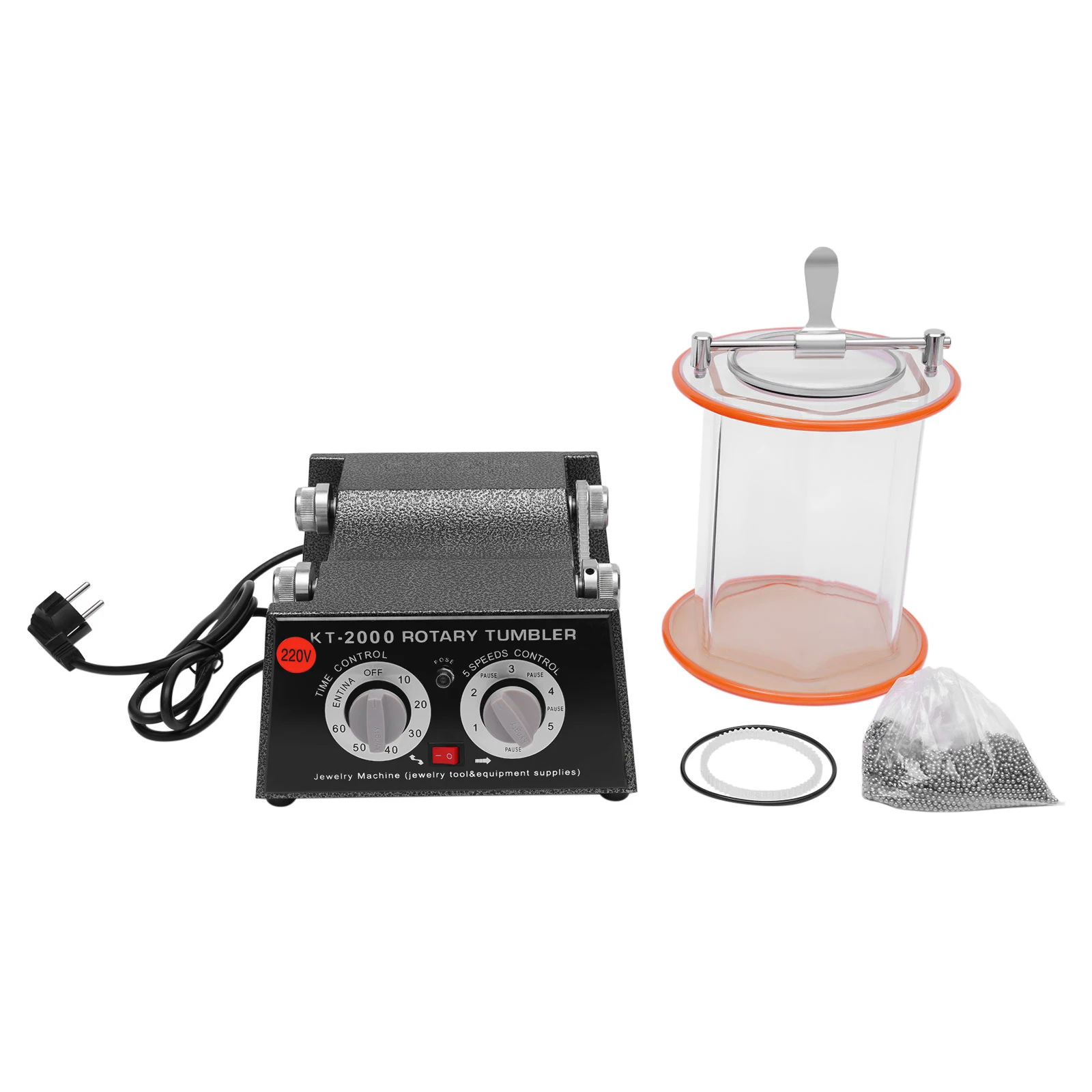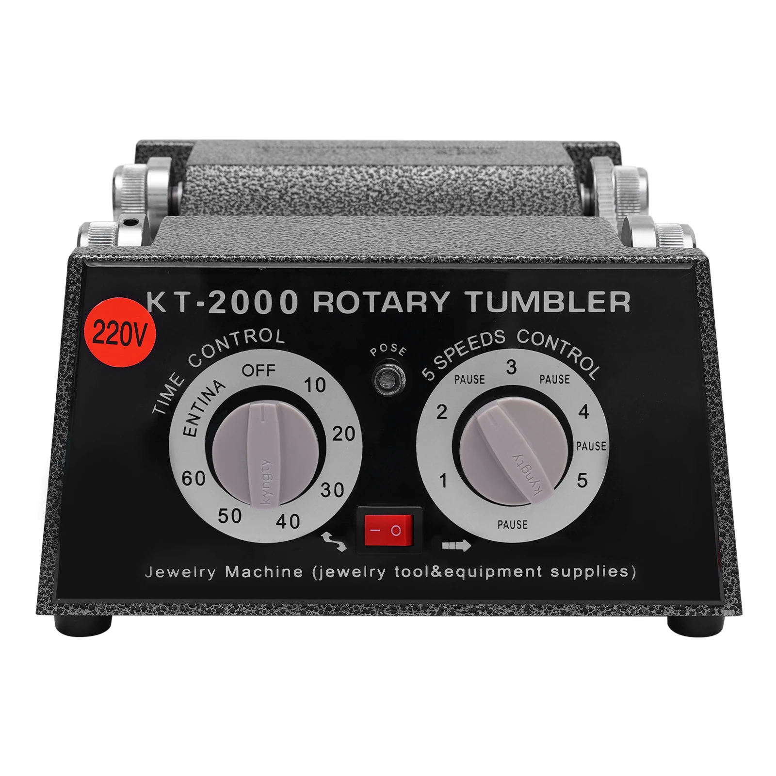 About switches of the Rotary Tumbler Jewelry Polisher, on the left is a timing switch. Turn the left is normally open, which is always opening; turn the right is the timing, set a few minutes and it will stop automatically. The right switch is the stalls, 1,2 ,3,4,5, each gear in the middle are separated by a stop.The red switch is reversing switch (Positive &negative switching), and it is not the on/ off.
