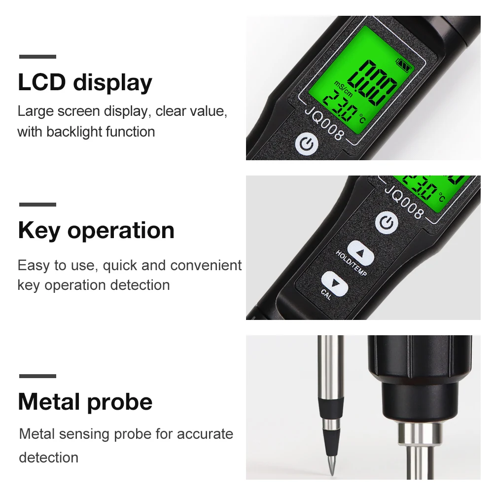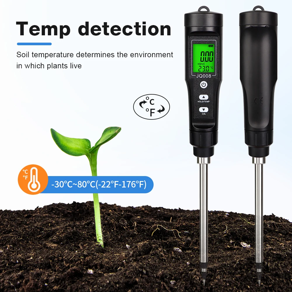 JQ008 LCD Digital Soil EC Tester Thermometer 0.00-10.00mS/cm Backlight Waterproof Soil Conductivity Meter for Flower Gardening