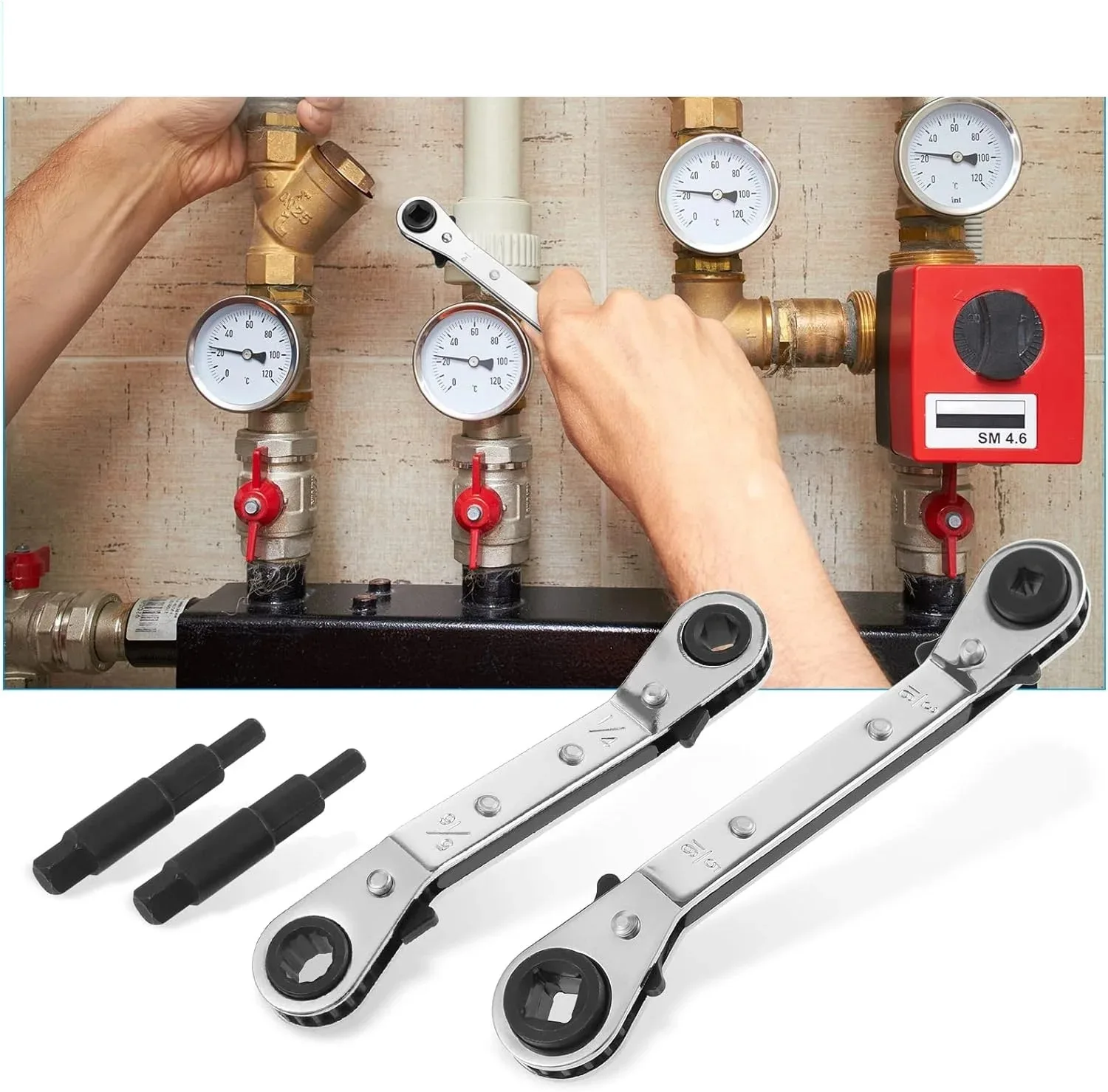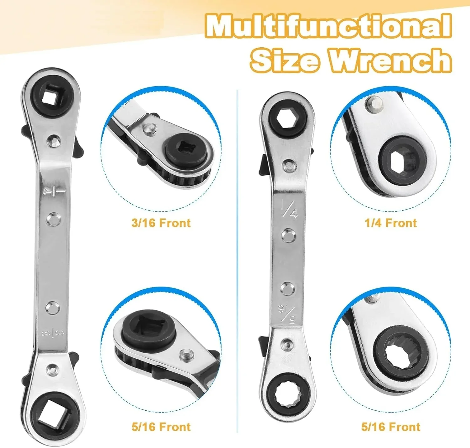 • 【HVAC Service Wrench Set 】--- Hvac service wrench set is an excellent tool for HVAC repair technology. Designed for maintenance and use, fit for air-conditioning, refrigeration and other equipment. Refrigeration wrench set are made of premium stainless steel, 4 in 1 Valve wrenches size include 1/4", 3/8", 3/16", 5/16", these sizes are the most commonly used sizes when repairing air conditioning and refrigeration equipment. Ratcheting Service Wrench has higher work efficiency and smoother maintenance actions