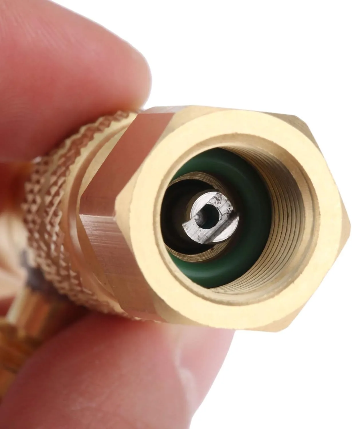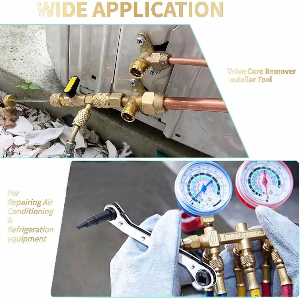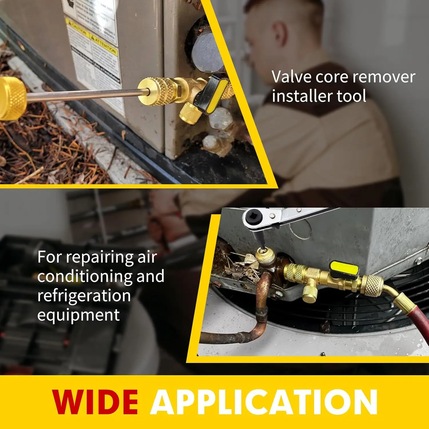 • 【Valve Core Remover Installer Tool】---The valve core remover tool can replace leaking valve cores quickly and easily. Remove and Install valve cores without loss of refrigerant. Suitable for home refrigeration equipments, dual size sae 1/4'' and 5/16'' port makes the valve core remover tool be fit for R22, R12, R407, R410, R404, R32 A/C air condition system, etc. (Not suitable for Automotive AC). The ball valve can be opened and closed in just a quarter-turn rather than a stem-type valve. Curved design increase hand friction, prevent all kinds of overpowered valves