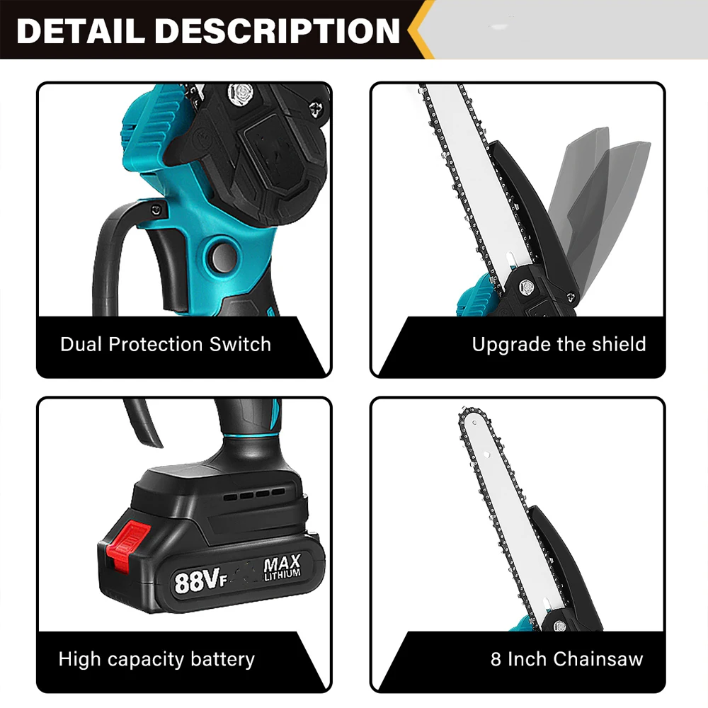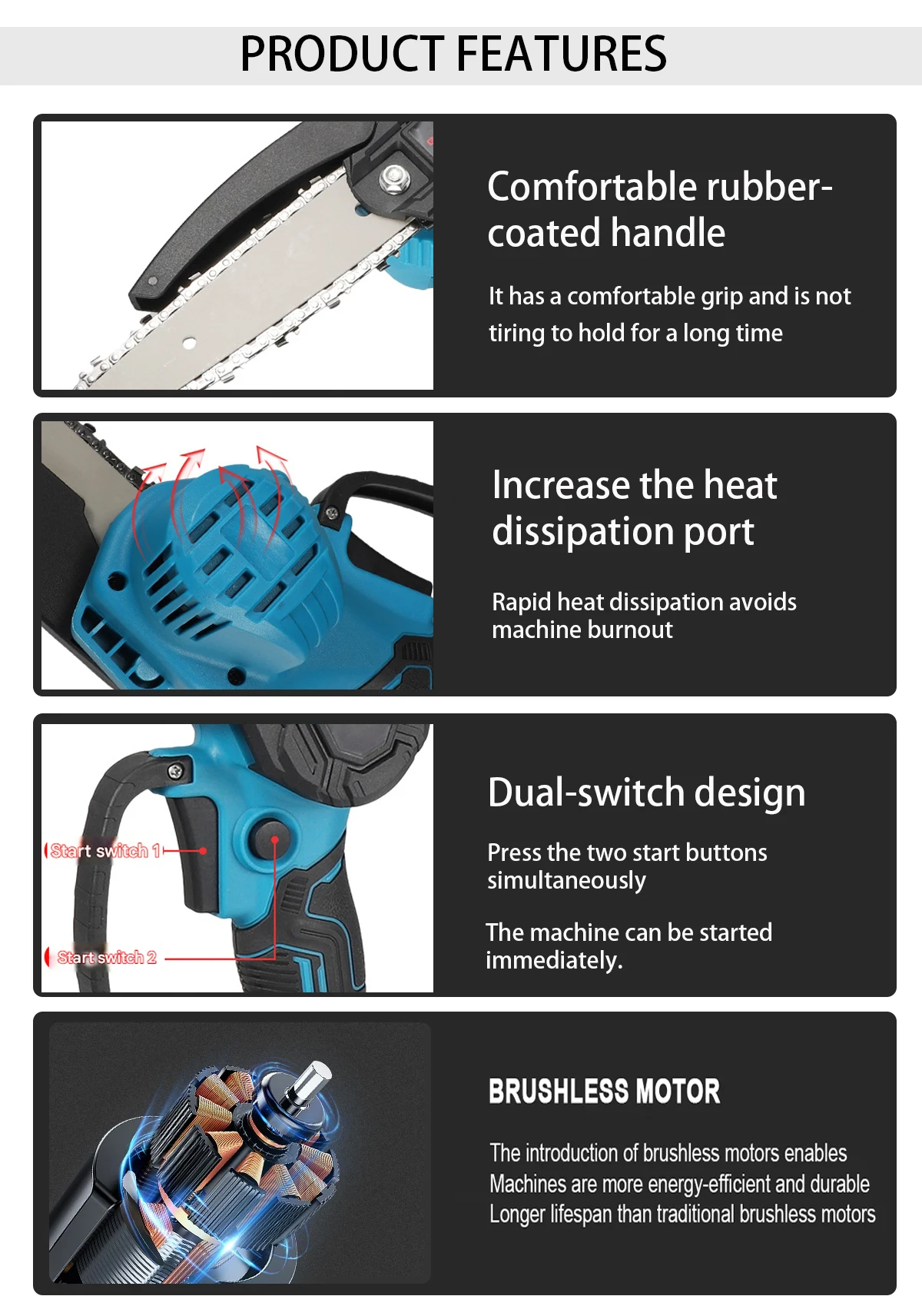 - Brushless copper motor:Strong power, more output stable than the chain saw modified by the angle grinder. High load so that can not easy to burn.