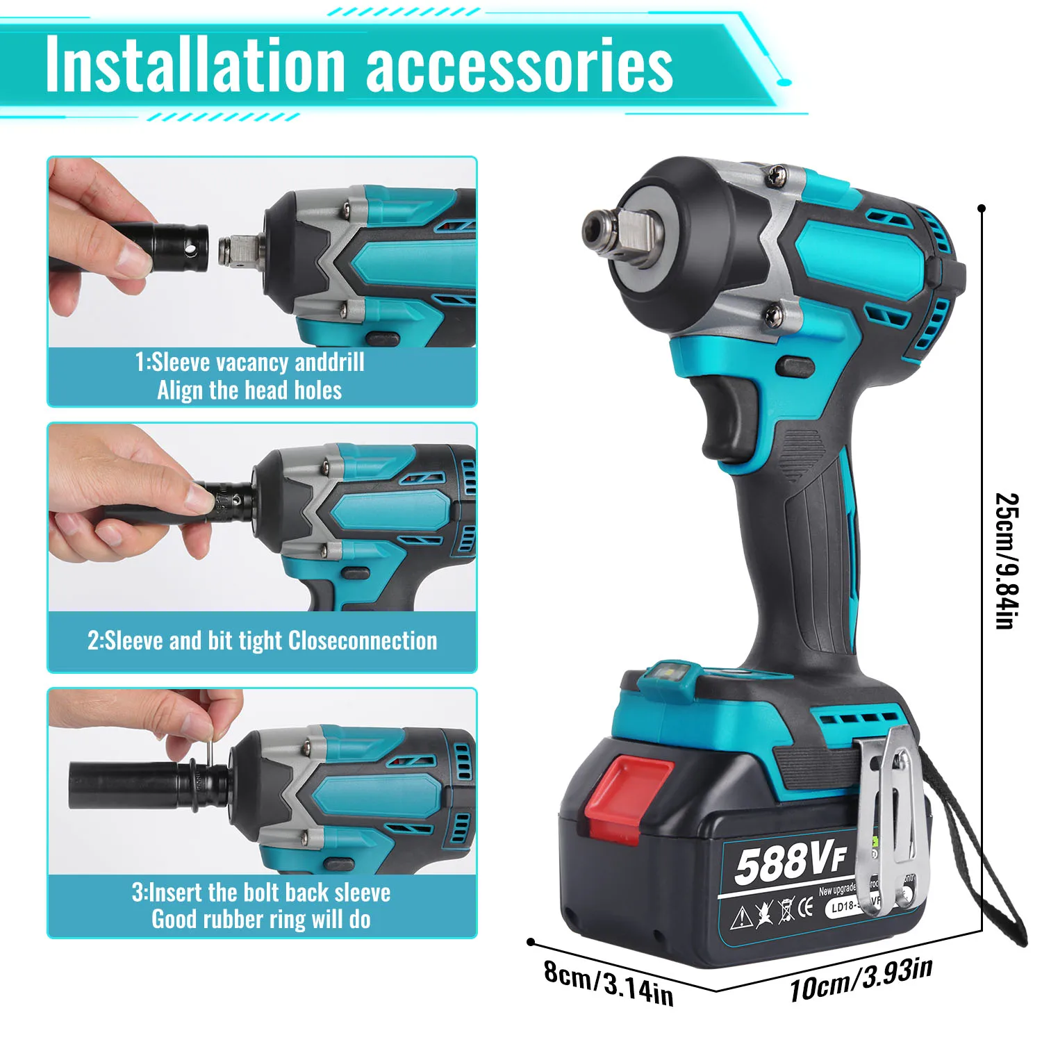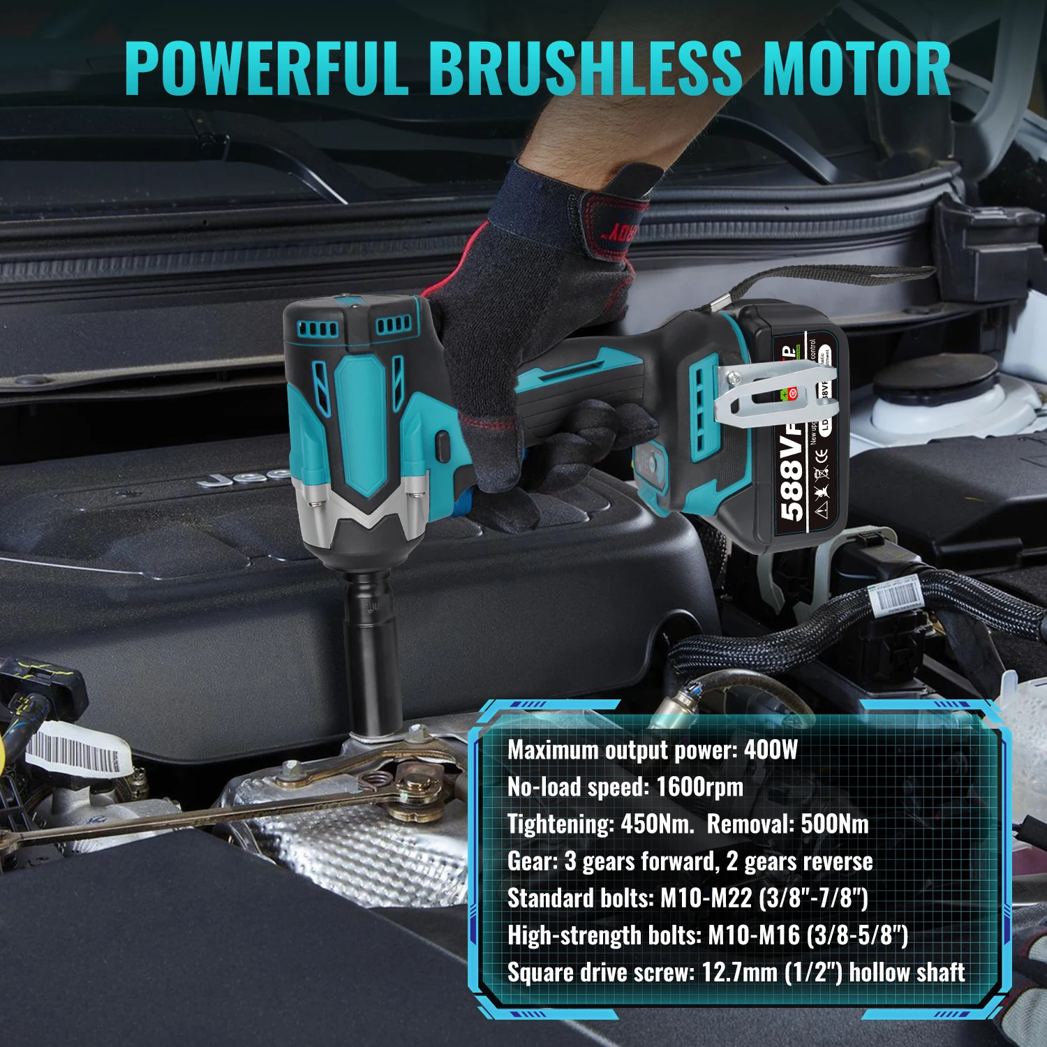 This brushless electric wrench is designed for high-intensity operations. It is equipped with a brushless motor and provides 450Nm tightening torque and 500Nm disassembly torque, which can easily cope with the high torque requirements of automobile tires, steel structures, etc. Anti-fall lanyard + LED lighting, safety and convenience!