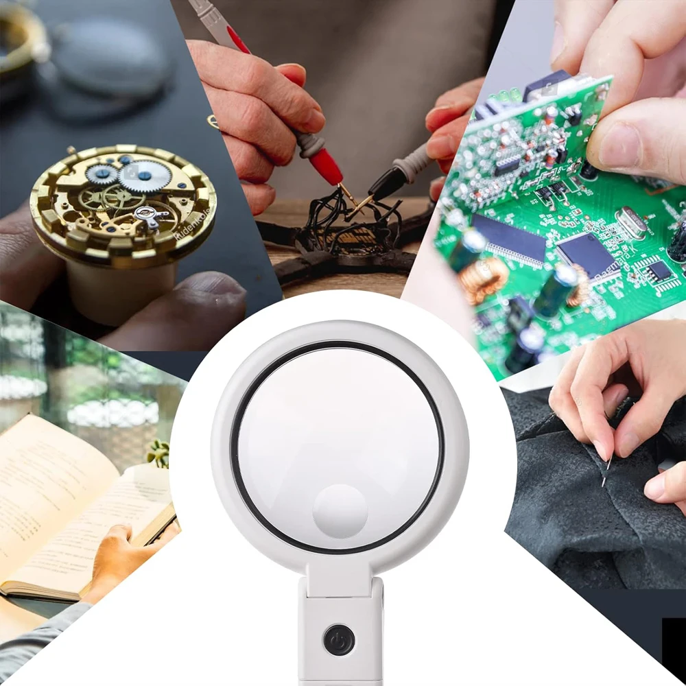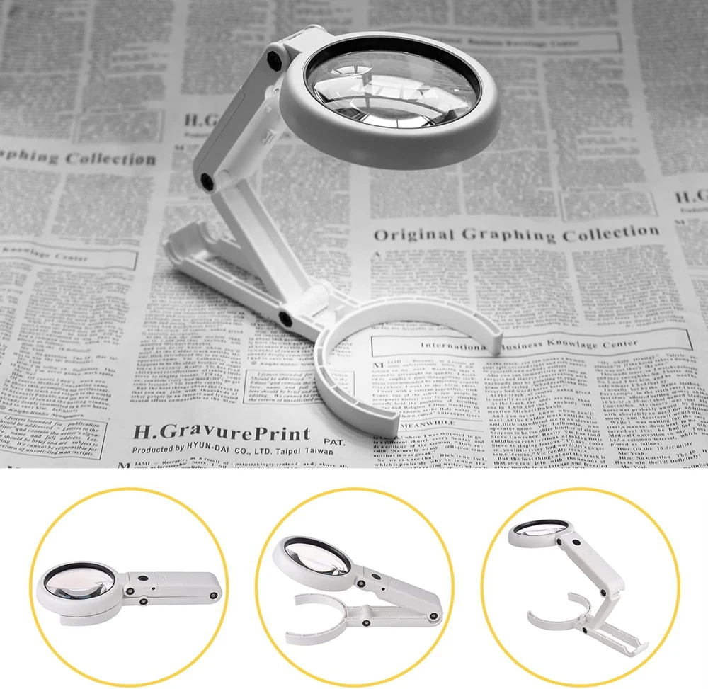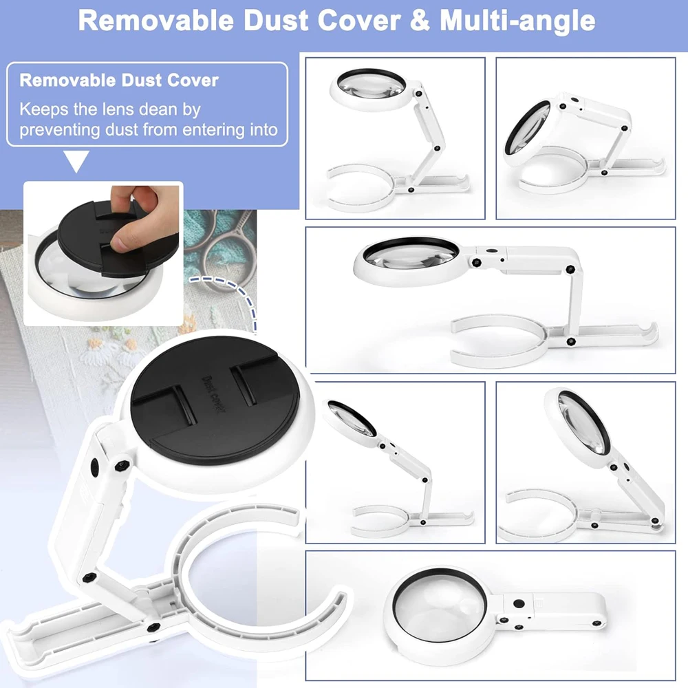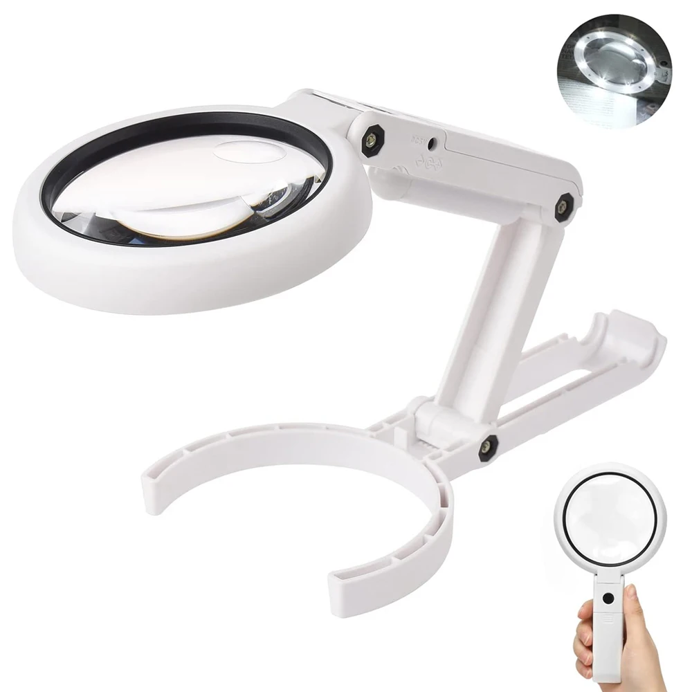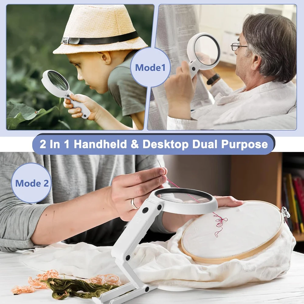 【Good Present】This lighted magnifying glass is suitable with stand for close work, easy to carry, sturdy and durable, advanced design, it is a perfect gift for the elderly and children, fold it up and put it on the desk for long time reading.