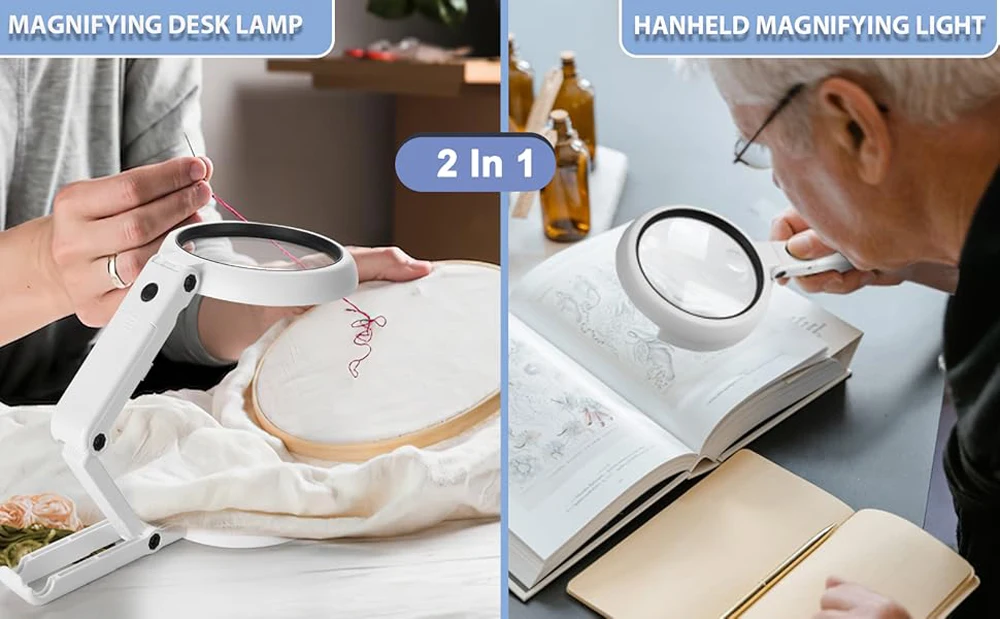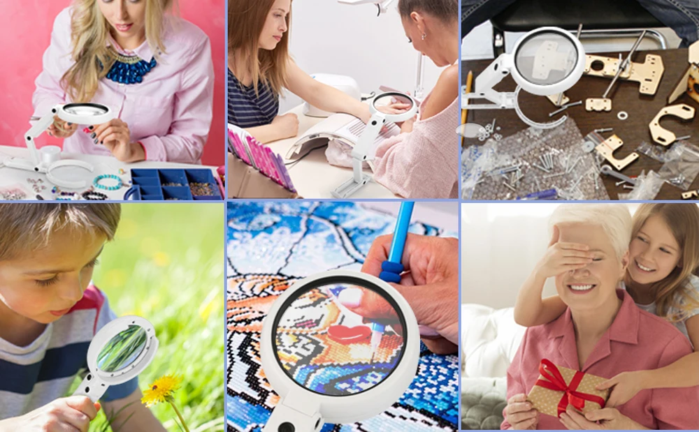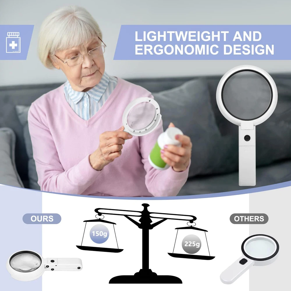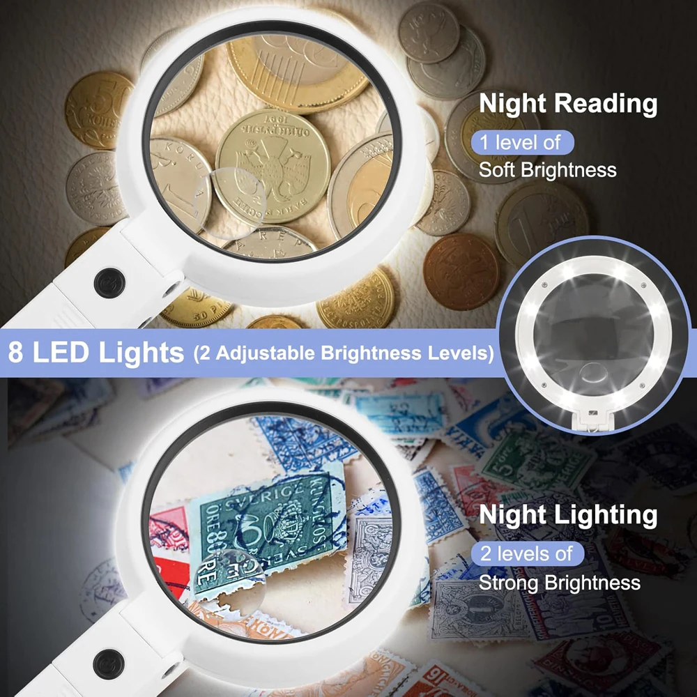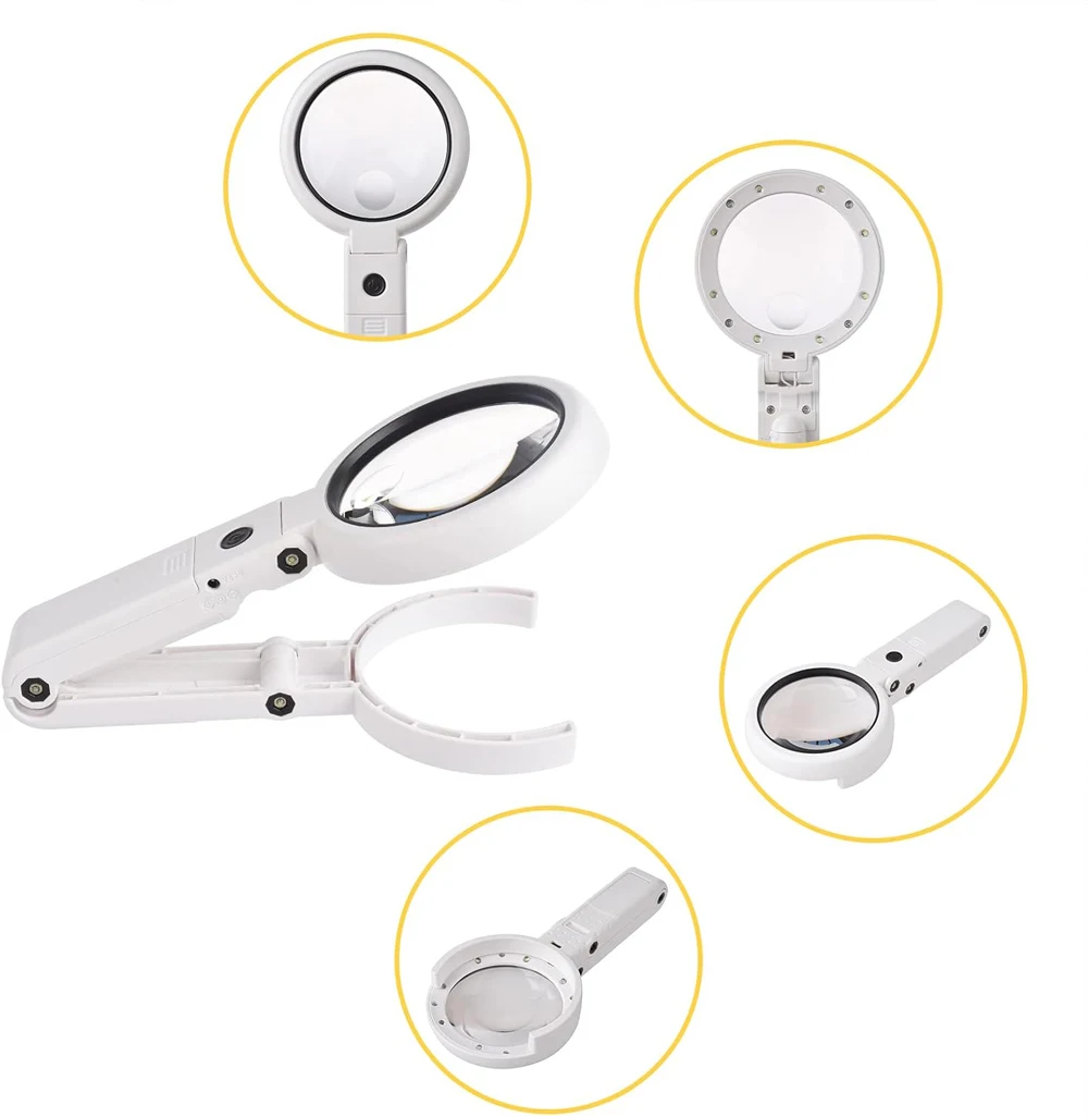 【Good Present】This lighted magnifying glass is suitable with stand for close work, easy to carry, sturdy and durable, advanced design, it is a perfect gift for the elderly and children, fold it up and put it on the desk for long time reading.