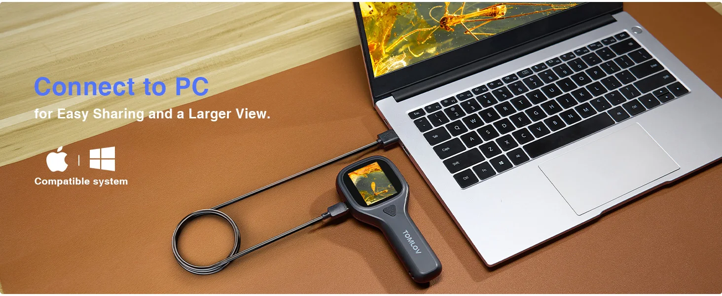• Capture & Share with Photo/Video Functions: Use the built-in camera to record videos and capture images, then connect the USB microscope to a Windows or macOS device for sharing or archiving observations