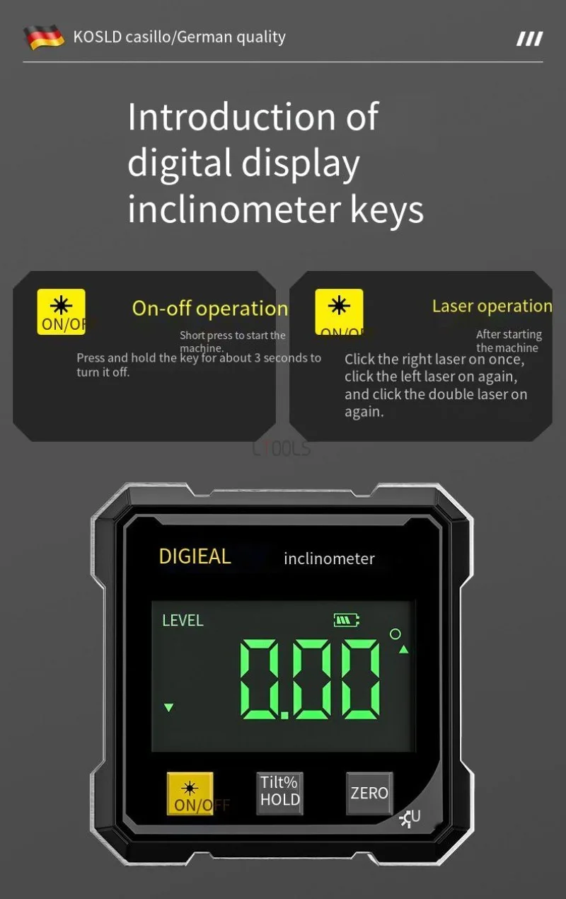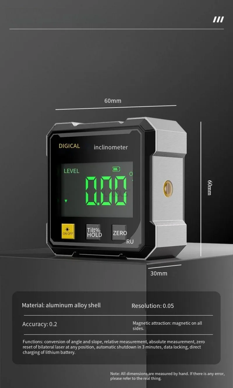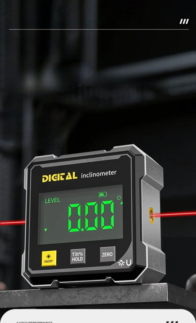 Adopting advanced tilt angle sensors, the measurement accuracy can reach ± 0.2 °, with a range covering 0-360 °, and can accurately measure various parameters such as slope, tilt angle, and horizontal angle. Paired with a high-definition LCD display screen, real-time measurement data is displayed, supporting multiple unit switching such as degree and percentage, and the reading is clear at a glance. Compared to traditional angle rulers, it does not require tedious calculations and can directly obtain accurate results, effectively improving measurement efficiency and accuracy.