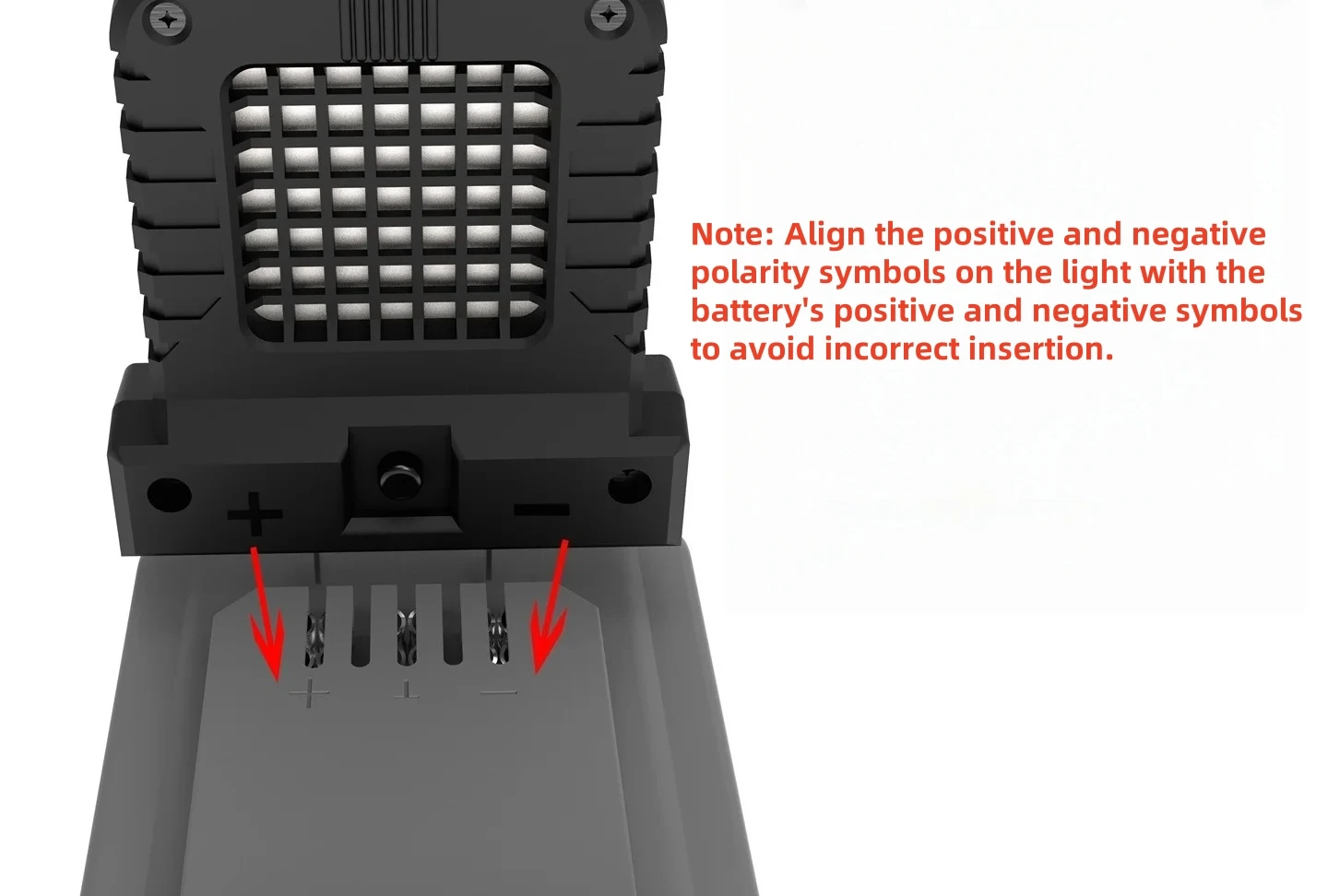 Note: Align the positive and negative polarity symbols on the light with the battery's positive and negative symbols to avoid incorrect insertion.