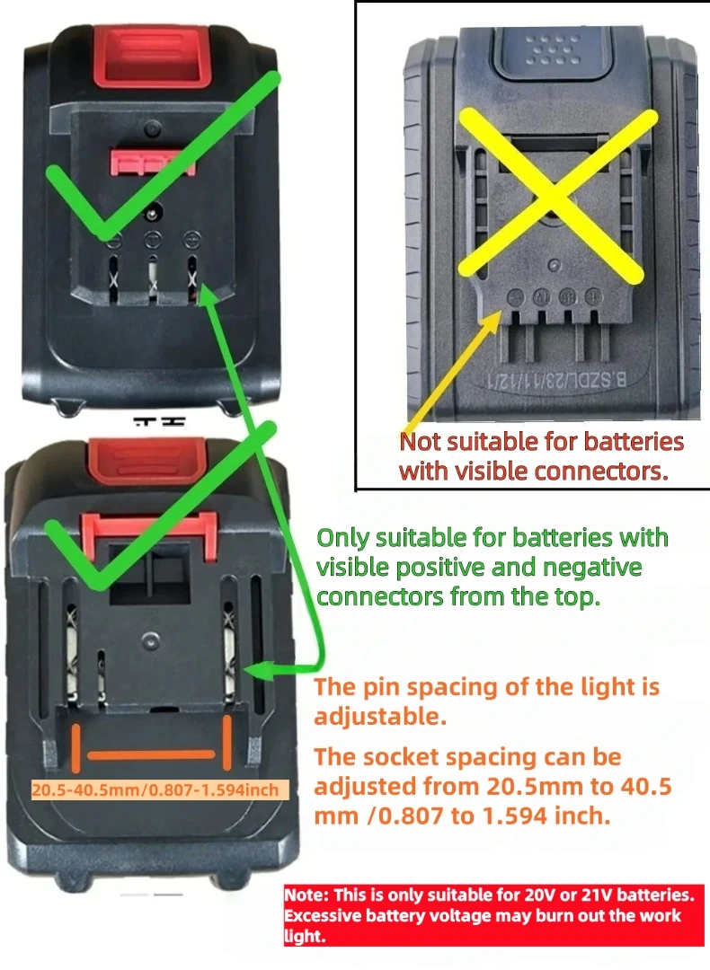 Note: This is only suitable for 20V or 21V batteries. Excessive battery voltage may burn out the work light.