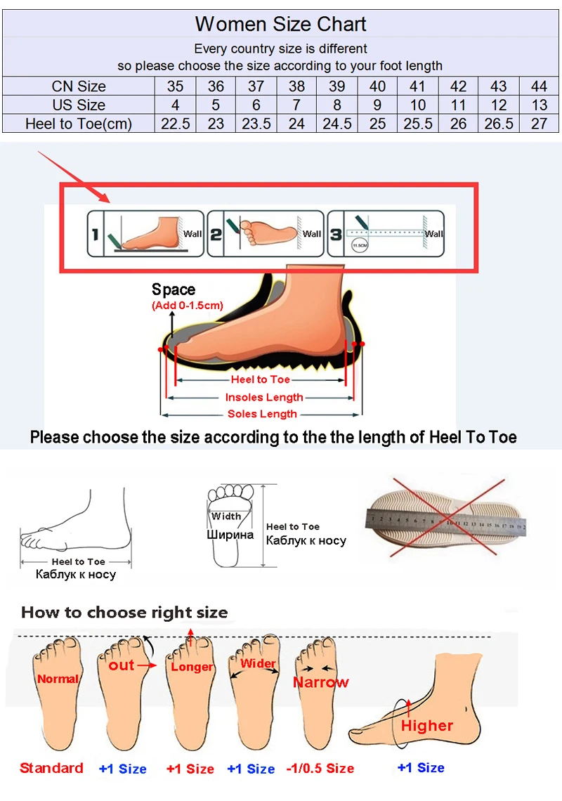 Notice: Hello, please measure your foot length (not insoles length or soles length) carefully and choose the right size according to your foot length, if your foot is wide or fat ,please choose one size larger, if your foot is slim or narrow,please choose one size smaller, thank you.