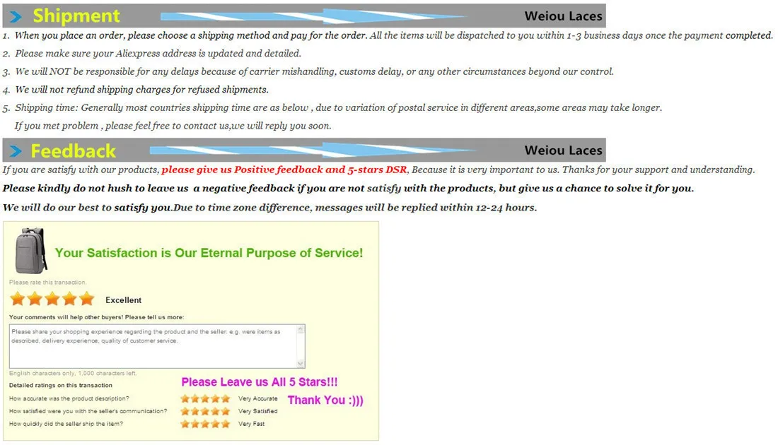 If you satisfy with our products,please give us Positive feedback and 5-stars DSR, Because it is very important to us. Thanks for your support and understanding. If not satisfyplease contact us before leaving negative feedback, we will do our best to help you to solve the problem.Due to time zone difference, messages will be replied within 12-24 hours.
