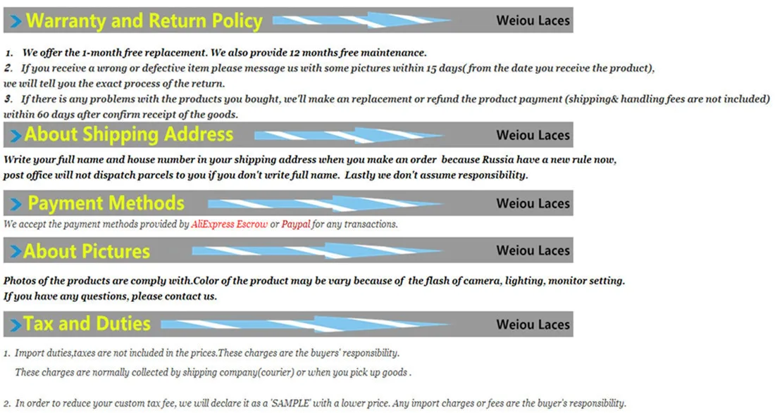 2.In order to reduce your custom tax fee, we will declare it as a 'SAMPLE' with a lower price. Any import charges or fees are the buyer's responsibility.