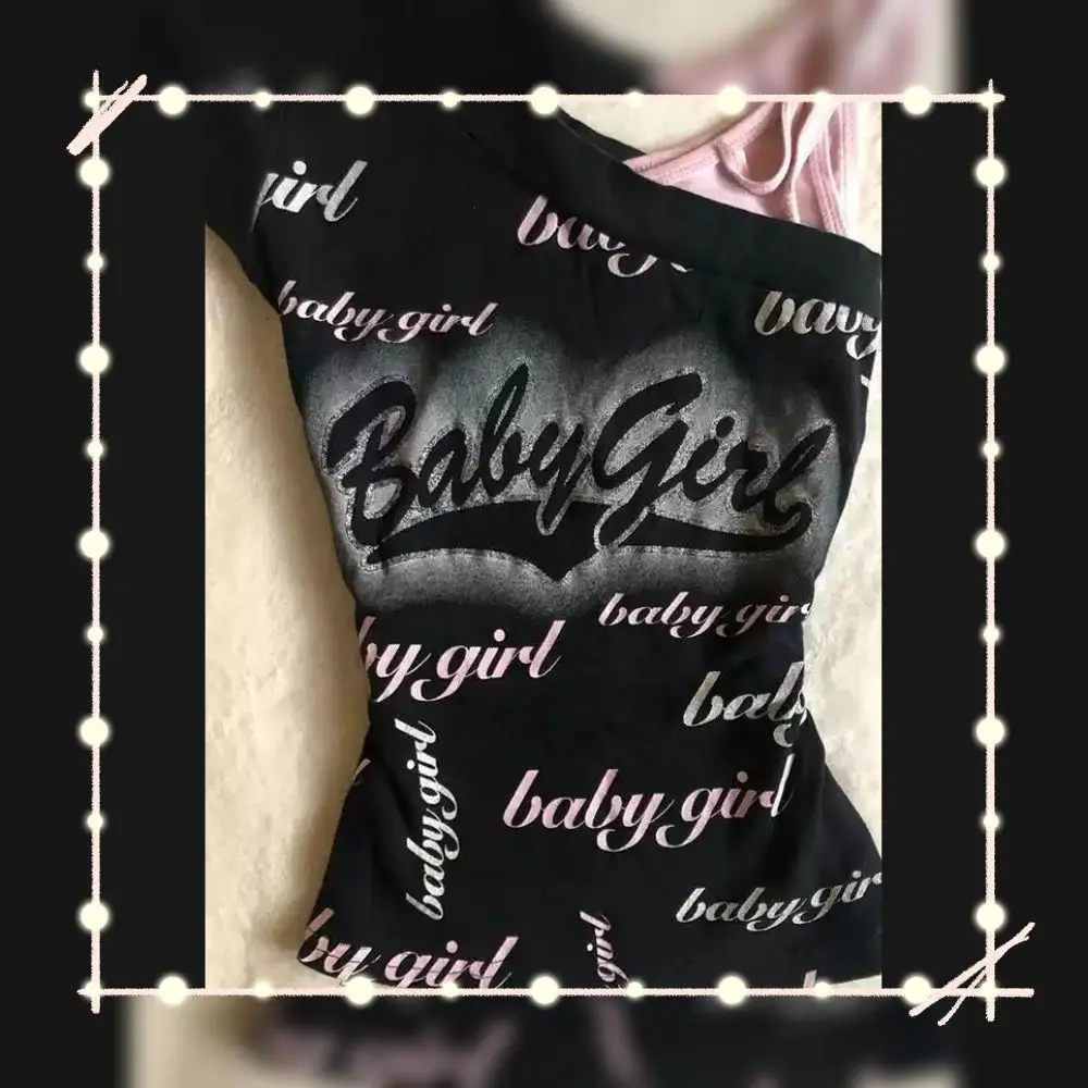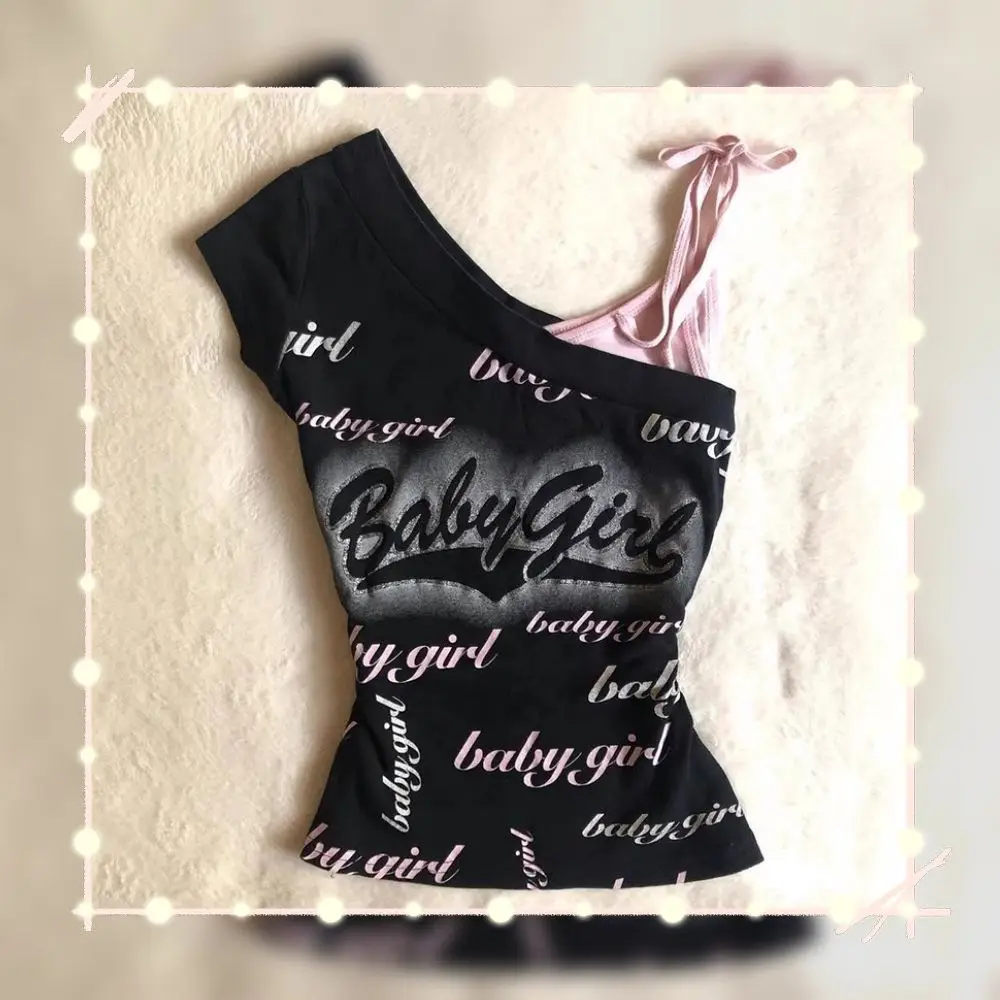 American High Street Cool Spice Girl Tank Tops Slim Waist Letter Print Slanted Off Shoulder T Shirt Women Grunge Y2k Top