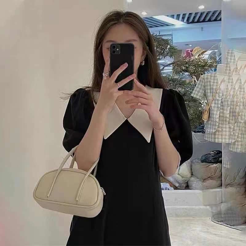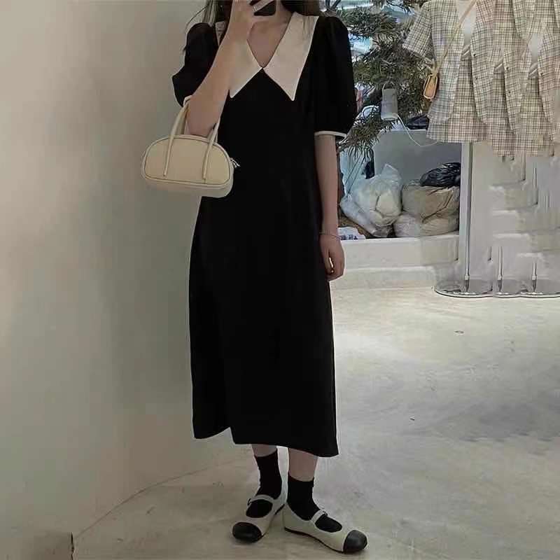 Black Dress Women Harajuku Simple Clothes Mujer Midi A-LINE Retro Summer Temperament Peter Pan Collar High Waist Vestidos Classy