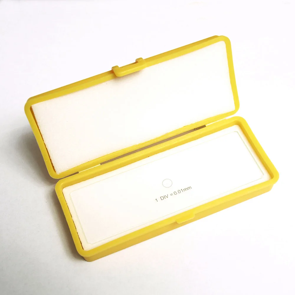 Size: 25mm x 75mm x 1.1mm Package Included: 1 x microscope micrometer The method of use is as follows: 1. Pull out one side of the eyepiece from the lens barrel, unscrew the part under the eyepiece, place the micro scale on the side of the eyepiece down on the focal plane of the eyepiece, reinstall the unscrewed part back into the eyepiece, and then insert the eyepiece back into the lens barrel . 2. Place the scale on the stage side micrometer upwards and clamp it on the stage so that the scale of the side micrometer is in the center of the field of view. Adjust the focus until you can see the graduation of the micrometer on the side of the stage. 3. Carefully move the micrometer on the stage side and turn the micrometer on the eyepiece side to make the straight line on the left of the two feet coincide, and then find the straight line where the two feet overlap another time from left to right. 4. Record the number of divisions of the micrometer on the eyepiece side and the micrometer on the stage side between the two coincident lines. Calculate the actual length represented by each grid on the side of the eyepiece. The actual length represented by each grid of the eyepiece ruler = (the number of grids of the stage micrometer between two overlapping lines/the number of grids of the eyepiece micrometer between two overlapping lines)×10um 5. Take off the micrometer on the side of the stage and replace the slide specimen to be measured, and measure the specimen with the micrometer on the eyepiece side.