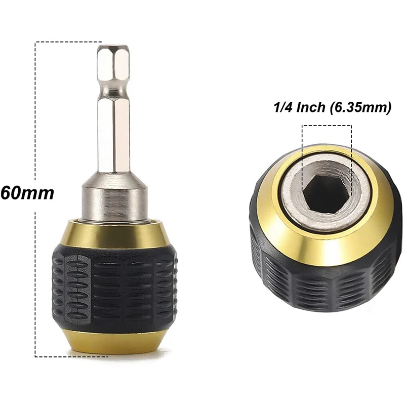 【Drill Bit Extension】Length: 60mm; Hex Shank Diameter: 1/4 inch (6.35mm); Hex Socket Diameter: 1/4 inch (6.35mm).