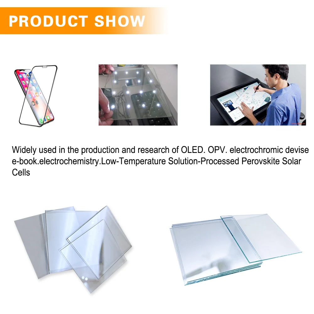 Indium Tin Oxid (ITO) coated glass belongs to the group of TCO (transparent conducting oxide) conductive glasses.ITO glass has the property of low sheet resistance and high transmittance, and it is widely used in the production and research of OLED, OPV, electrochromic device, e-book, electrochemistry, Low-Temperature Solution-Processed Perovskite Solar Cells, et al