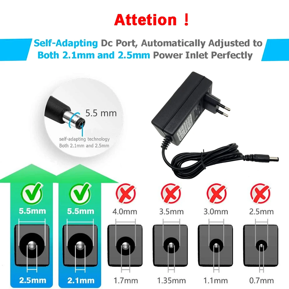 DC plug size Outer Diameter: 5.5mm . Inner Diameter: 2.1-2.5mm