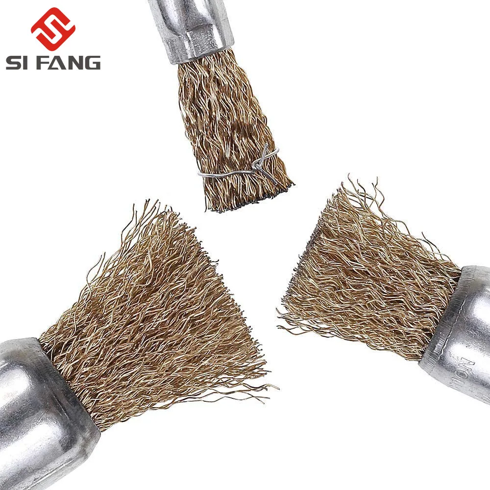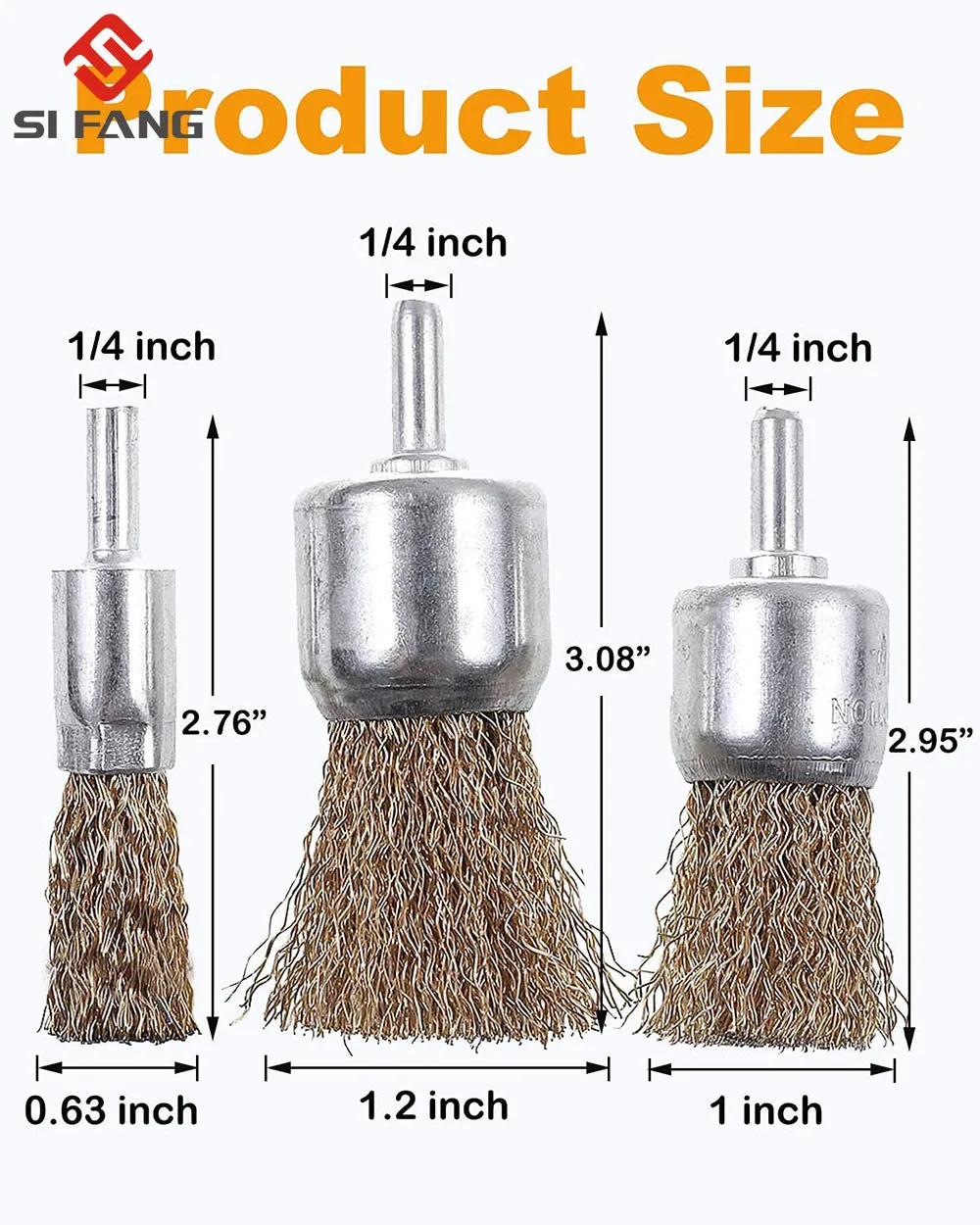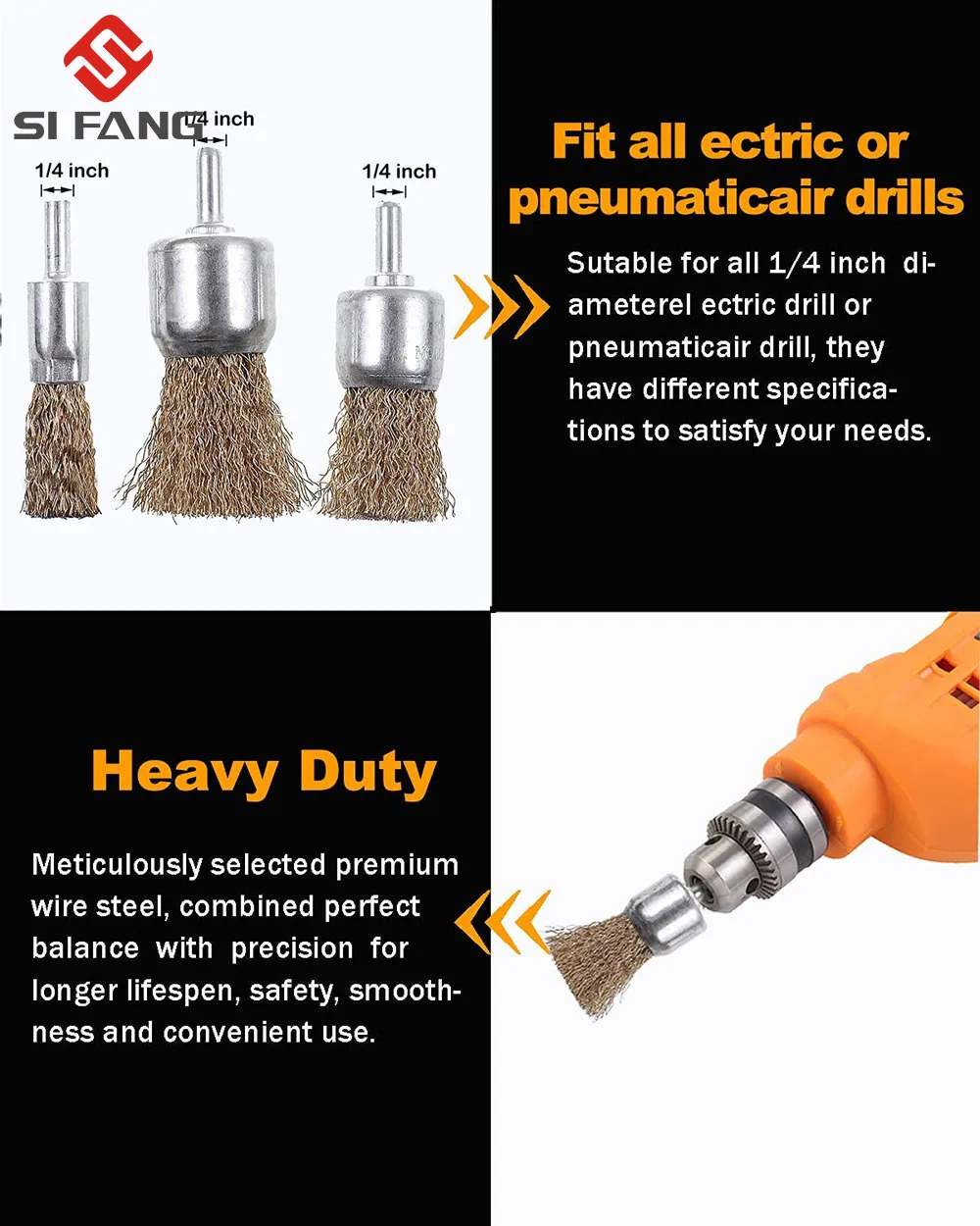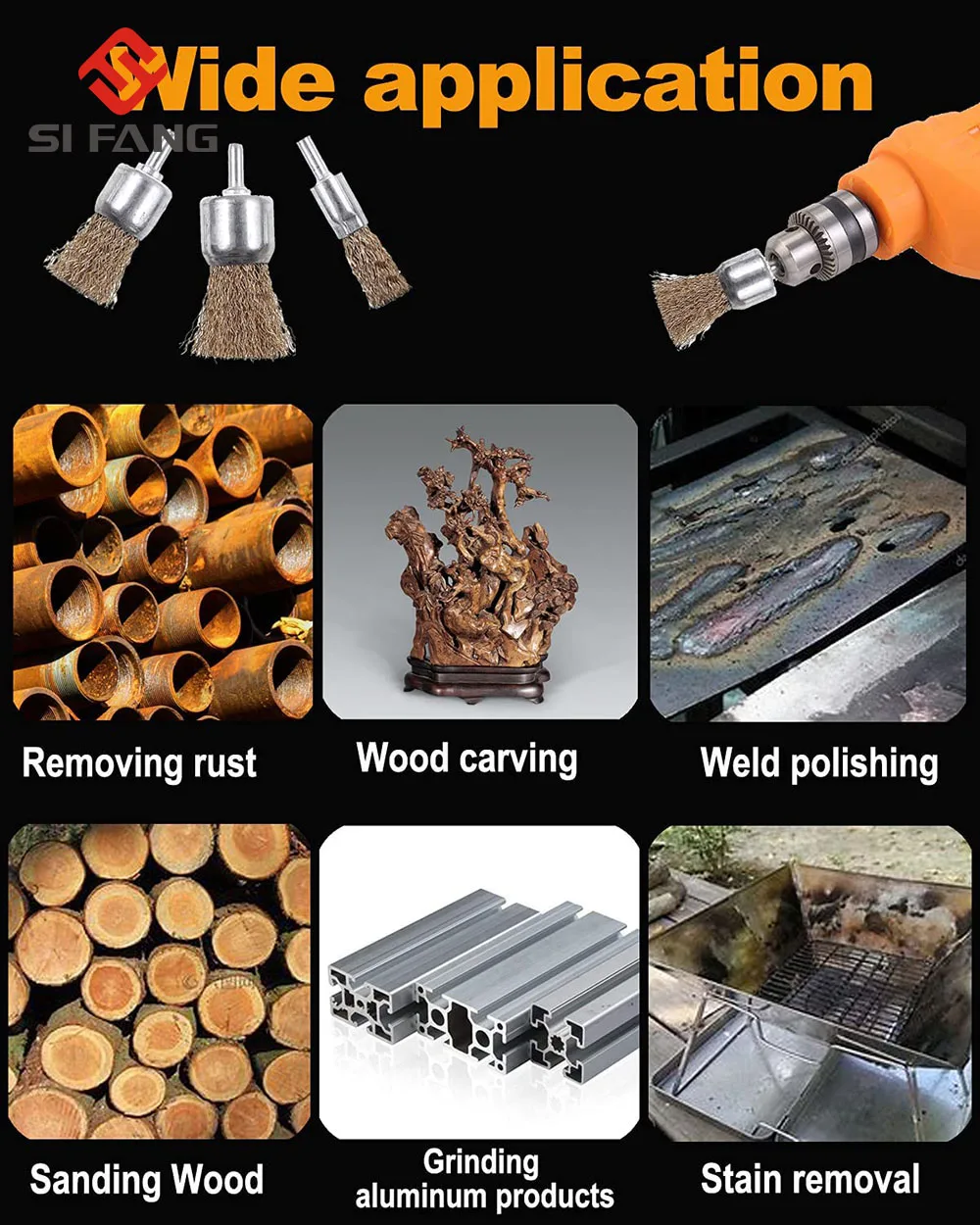 Wire grinder brush for drill can be used for surface adhesion treatment before painting, spray coating and electroplating. It can also be used for surface paint peeling and grinding.