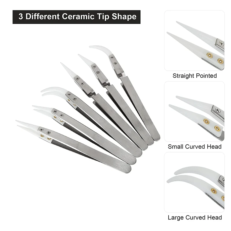 [6 Pieces of Reverse Tweezers, 3 Different Shapes]There are 6 pieces in total. Includes 2 x Straight Tip Tweezers, 2 x Large Elbow Tweezers, 2 x Small Elbow Tweezers. 3 different ceramic tip shapes to meet your different needs.