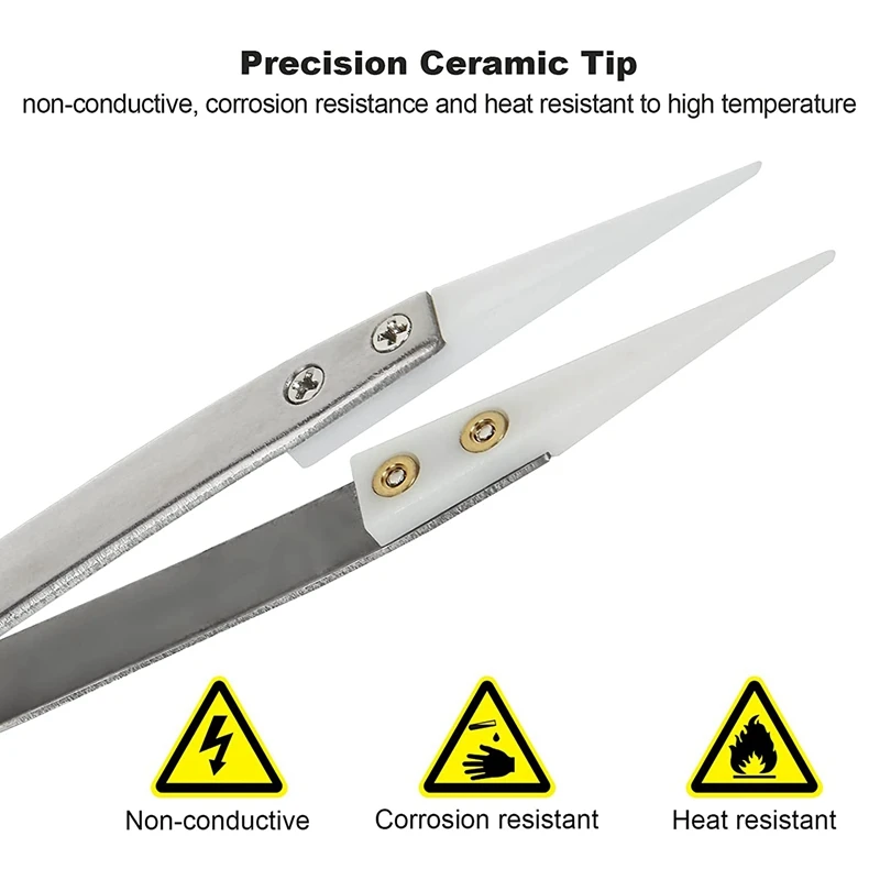 [Premium Material]Our precision ceramic tweezers are made of high-quality stainless steel with ceramic tips, which are strong, durable, non-conductive, anti-static, anti-magnetic, heat and corrosion resistant, and can withstand high temperatures up to 3000 F.