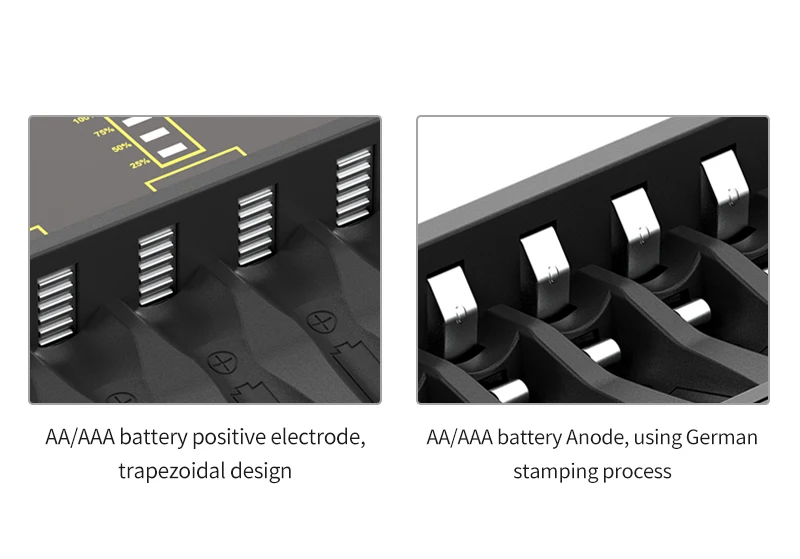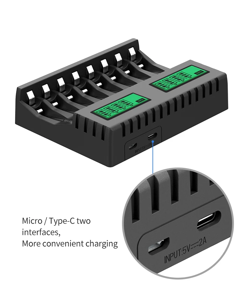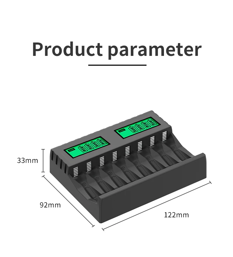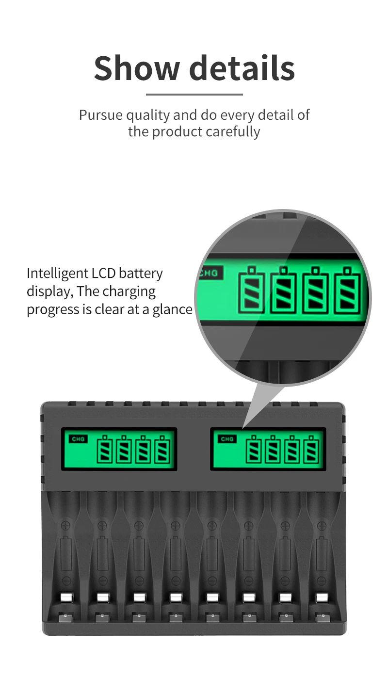 1.This charger can charge 1-8pcs AA/AAA Ni-MH/Ni-Cd rechargeable batteries, LCD displays.