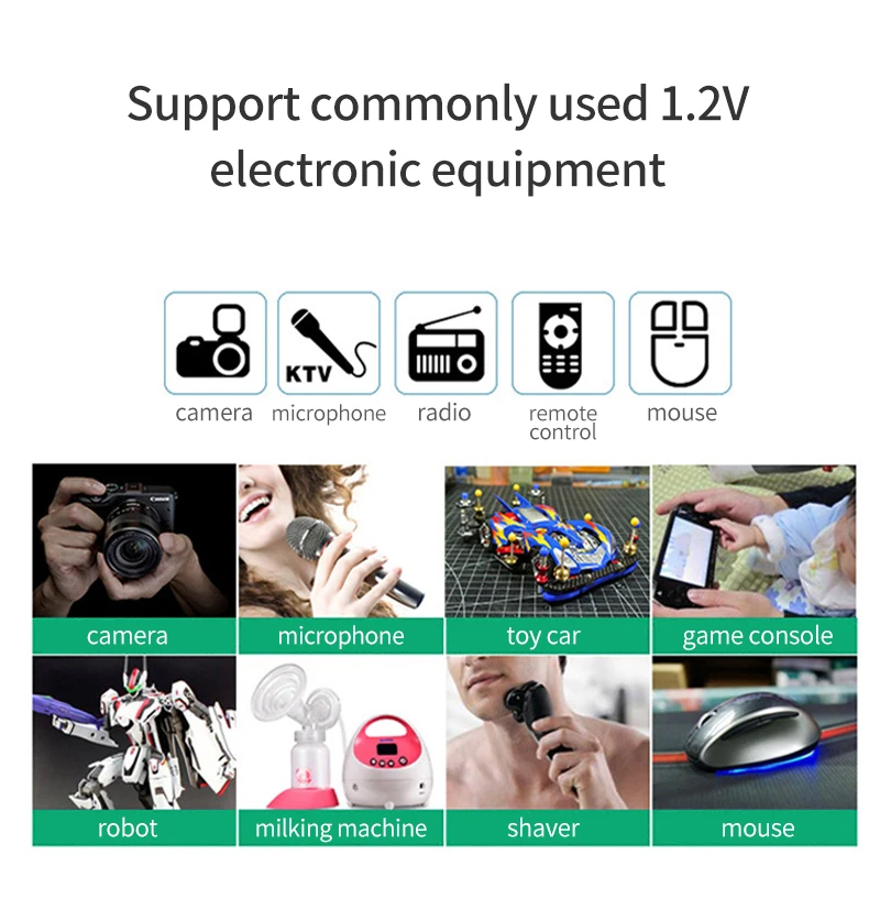Output | 1.2V, DC 1800mA AA: 1800mA*1/ 900mA*2/ 600mA*3/ 450mA*4/ 380mA*5/300mA*6/225mA*7/225mA*8 AAA: 900mA*1/ 450mA*2/ 330mA*3/ 225mA*4 / 180mA*5/150mA*6/125mA*7/110mA*8 |