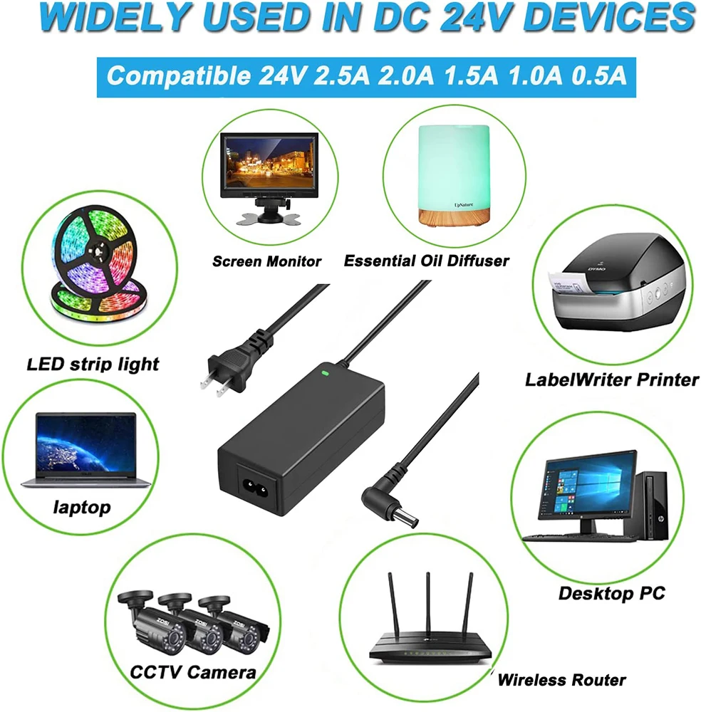 24V 2.5A Power Supply Adapter for Christmas Tree LED Strip Light,Vizio Soundbar,Zebra Printers,Dymo 4XL Printer,Compatible with