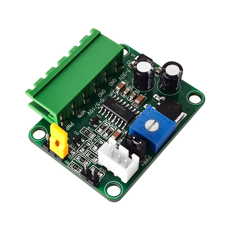 1. 0-5V or 0-10V analog input voltage into 0-100% PWM signal. PWM signal frequency 2KHZ-20KHZ range, the maximum is 20KHZ. Default factory is the minimum is 2KHZ. default function is 0-10V to 0-100% of the 2KHZ PWM signal, customers can adjust the potentiometer on the board to set the corresponding frequency output size according to demand.