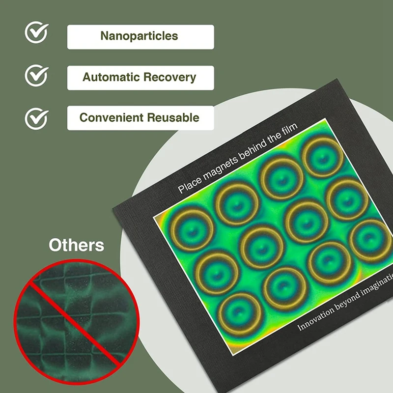 A great tool for science lovers, the film will change shades when magnetic fields are applied and it turns darker when field lines are perpendicular to the surface and it turns lighter when the liens are horizontal.