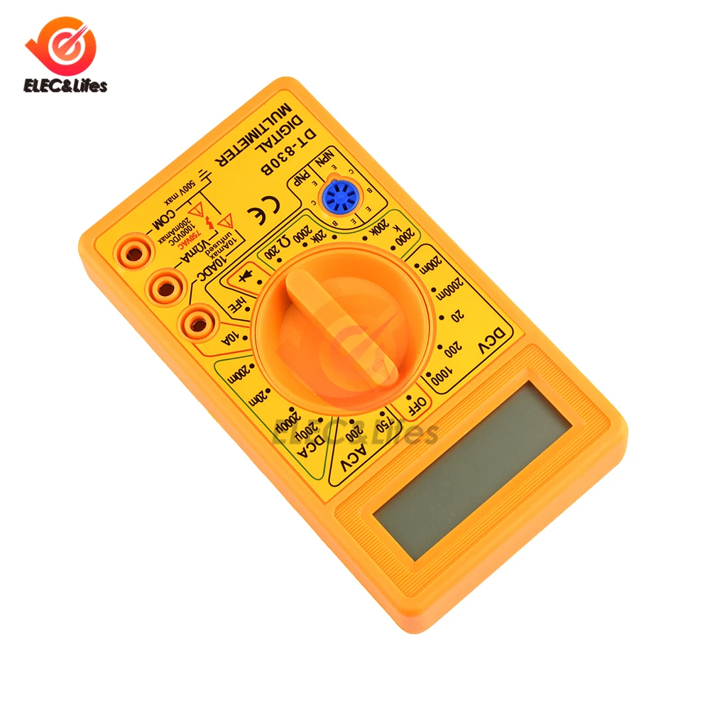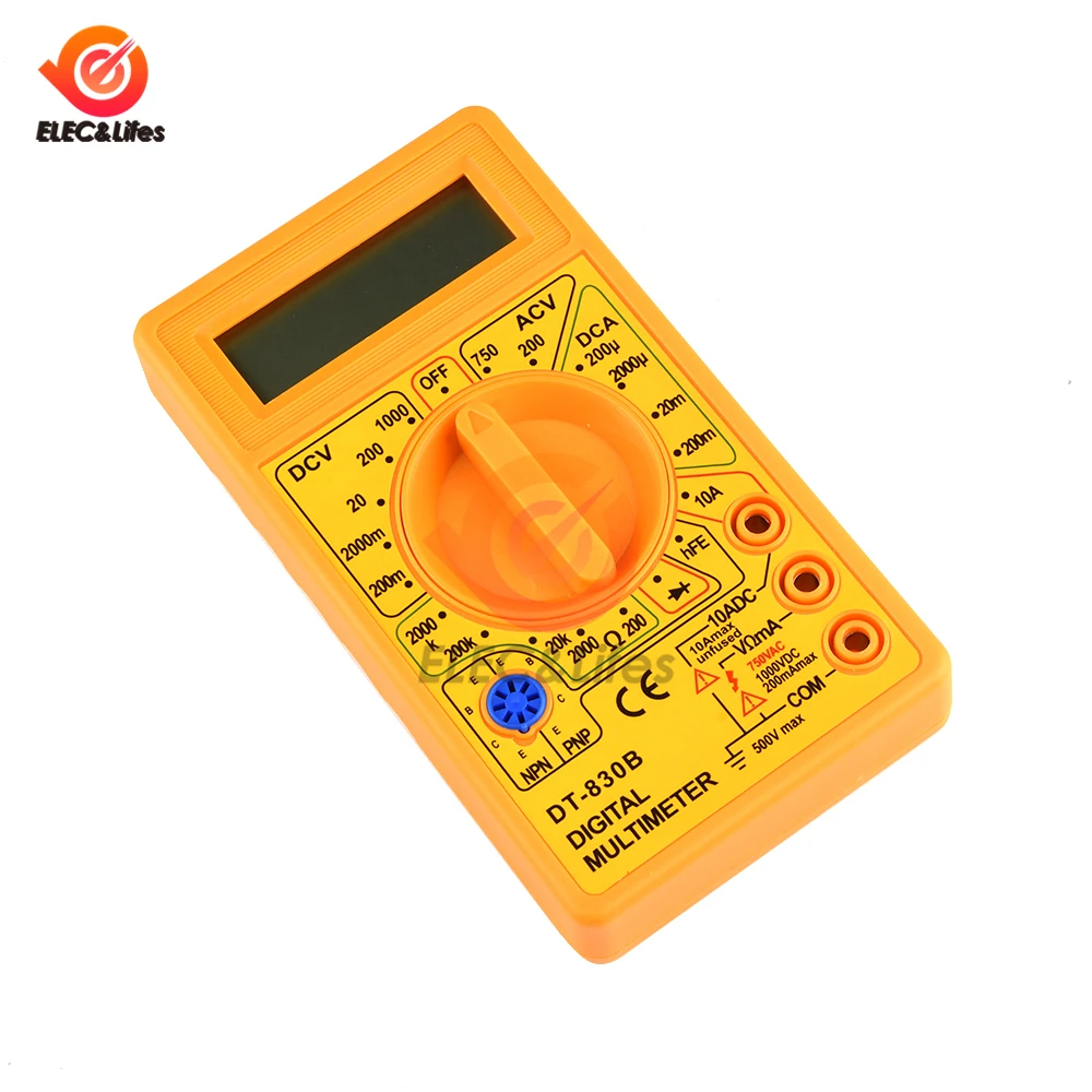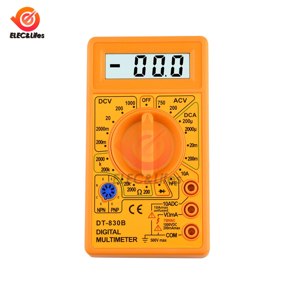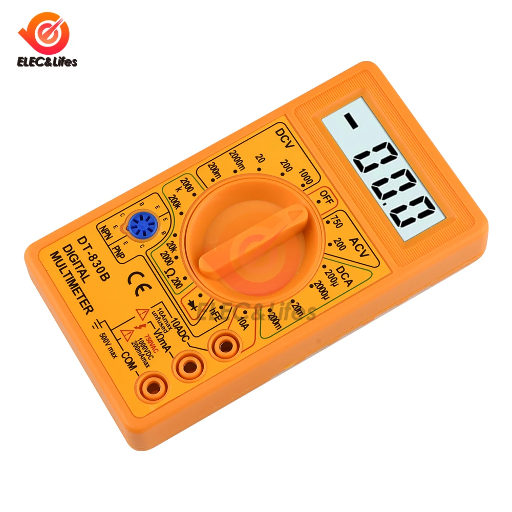 The DT830 digital multimeter is a three-and-a-half-digit LCD display small digital multimeter. It can measure AC, DC voltage and DC current, resistance, transistor β value, diode conduction voltage and circuit short circuit, etc. A rotary band switch can change the measurement function and range, with a total of 19 levels.
