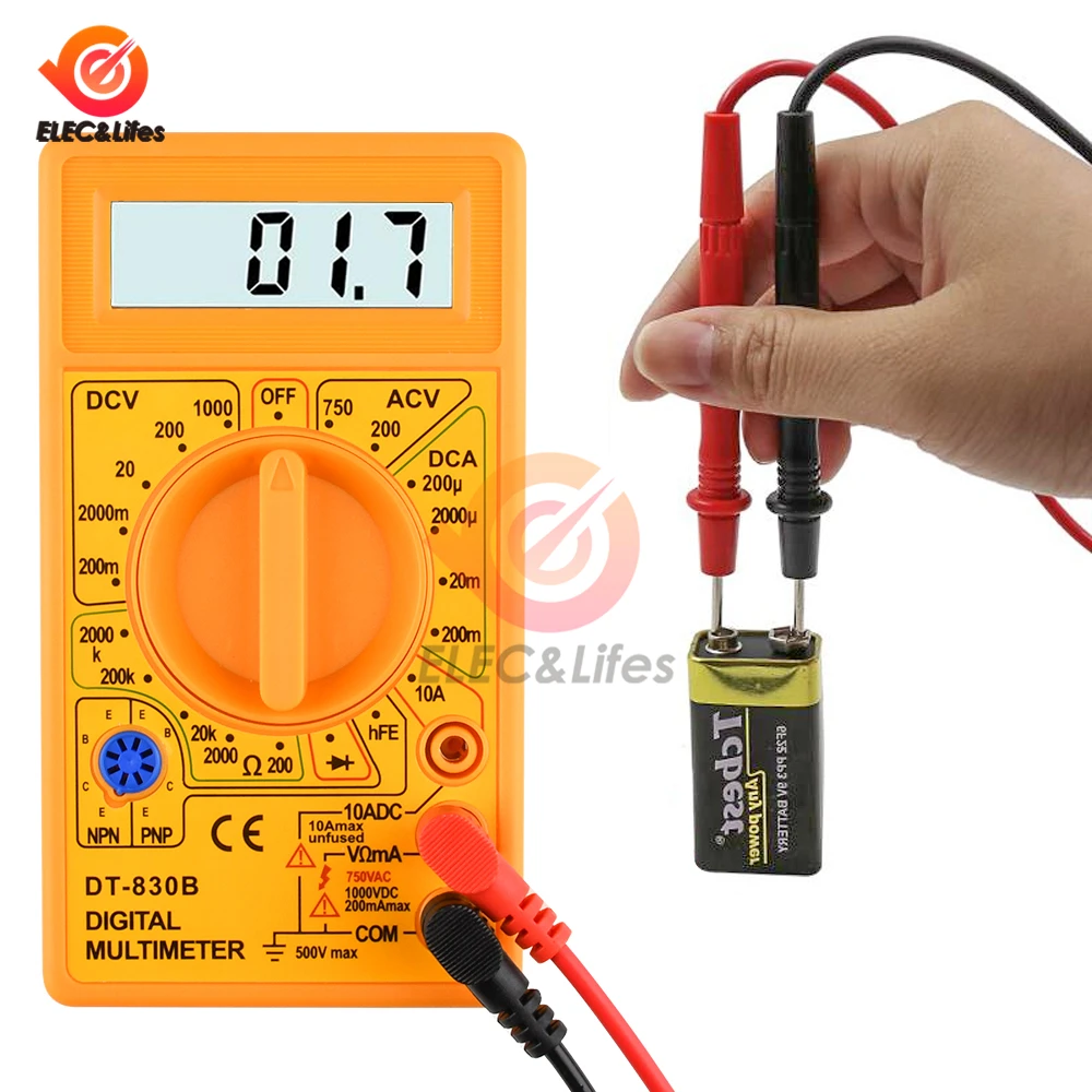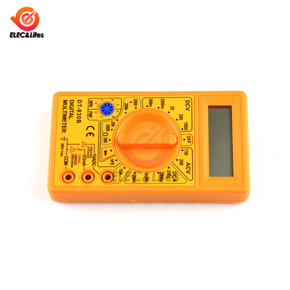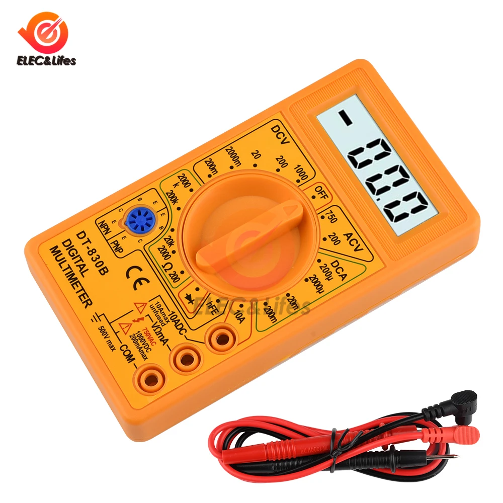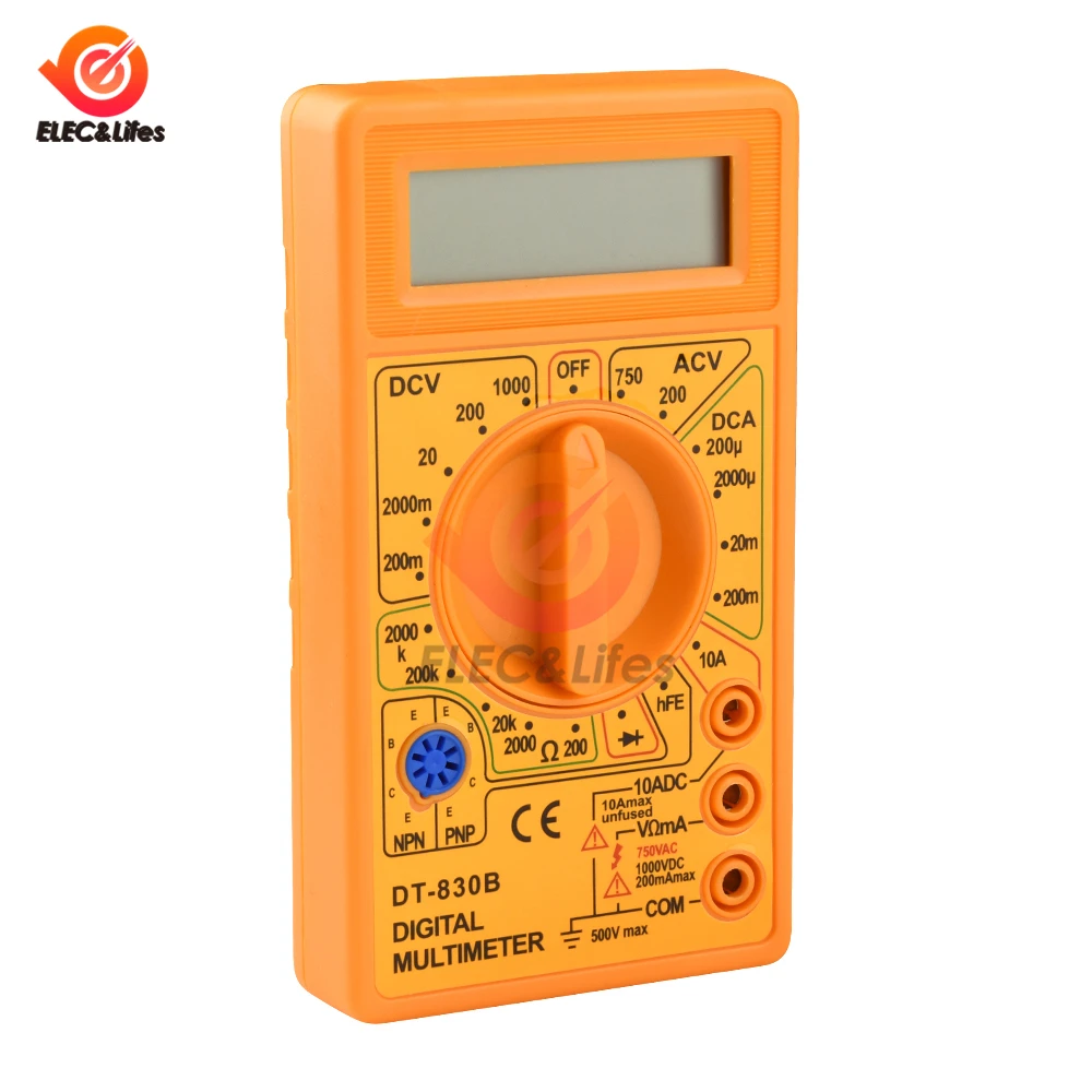 The DT830 digital multimeter is a three-and-a-half-digit LCD display small digital multimeter. It can measure AC, DC voltage and DC current, resistance, transistor β value, diode conduction voltage and circuit short circuit, etc. A rotary band switch can change the measurement function and range, with a total of 19 levels.