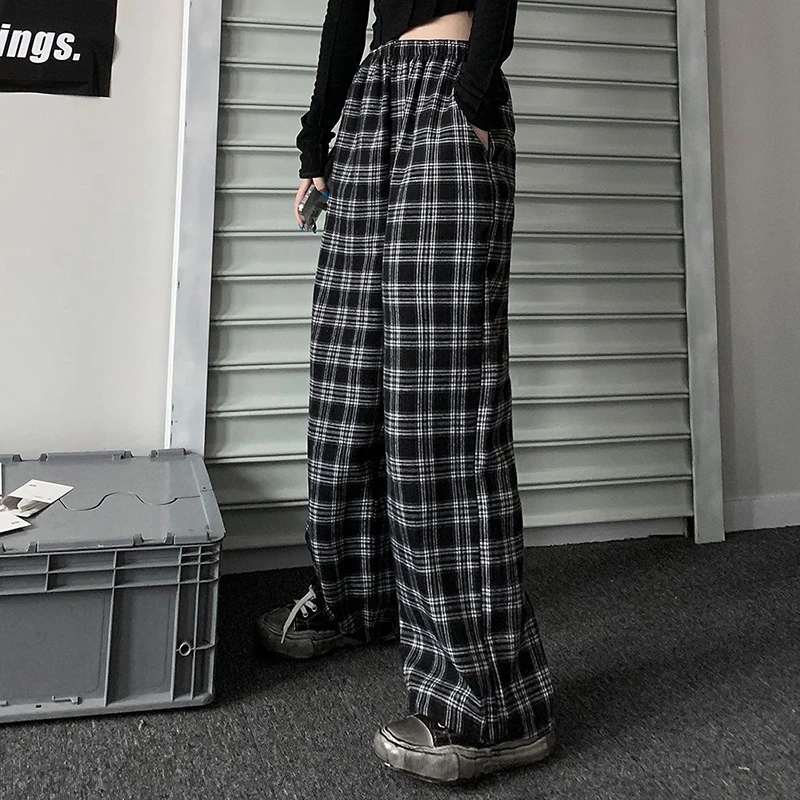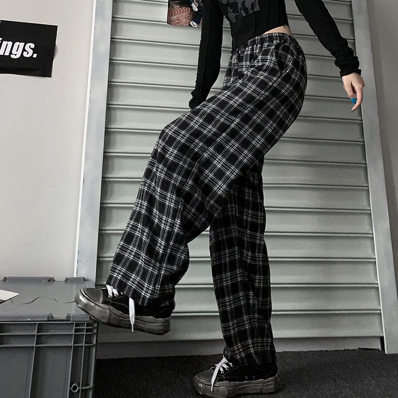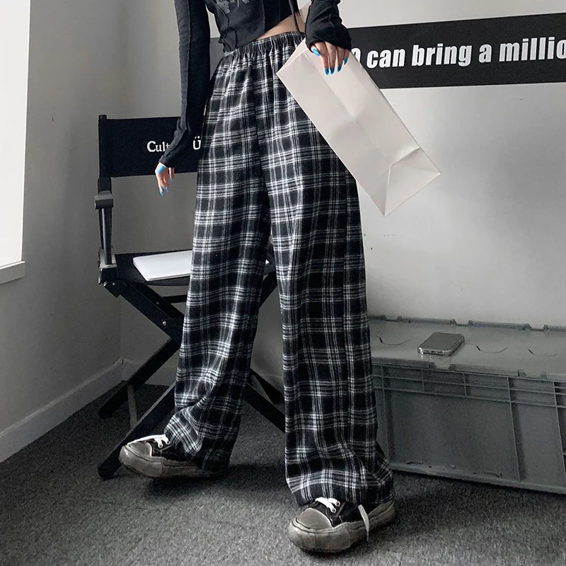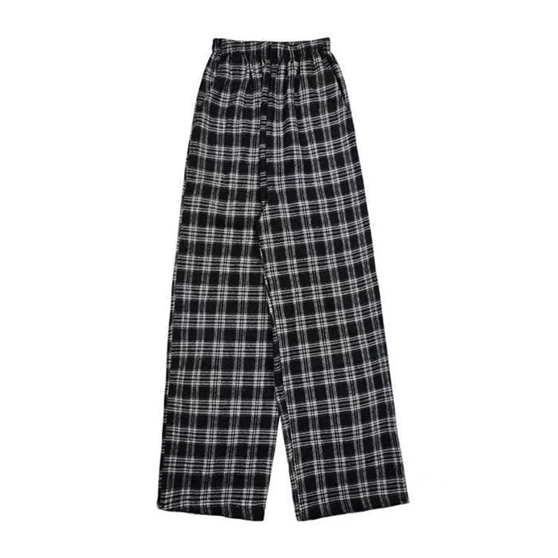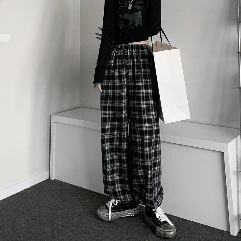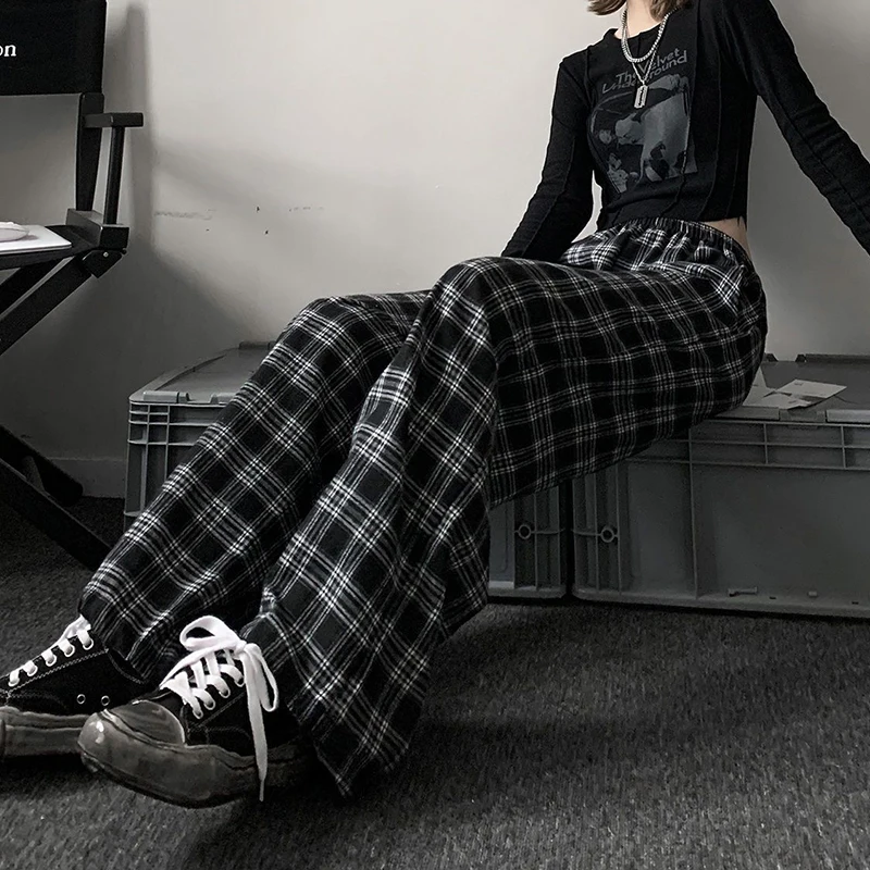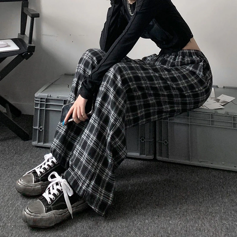 Jmprs Oversize Women Sweatpants Summer Fashion Black Plaid Casual Pants Elastic Waist Casual Pockets Student Trousers