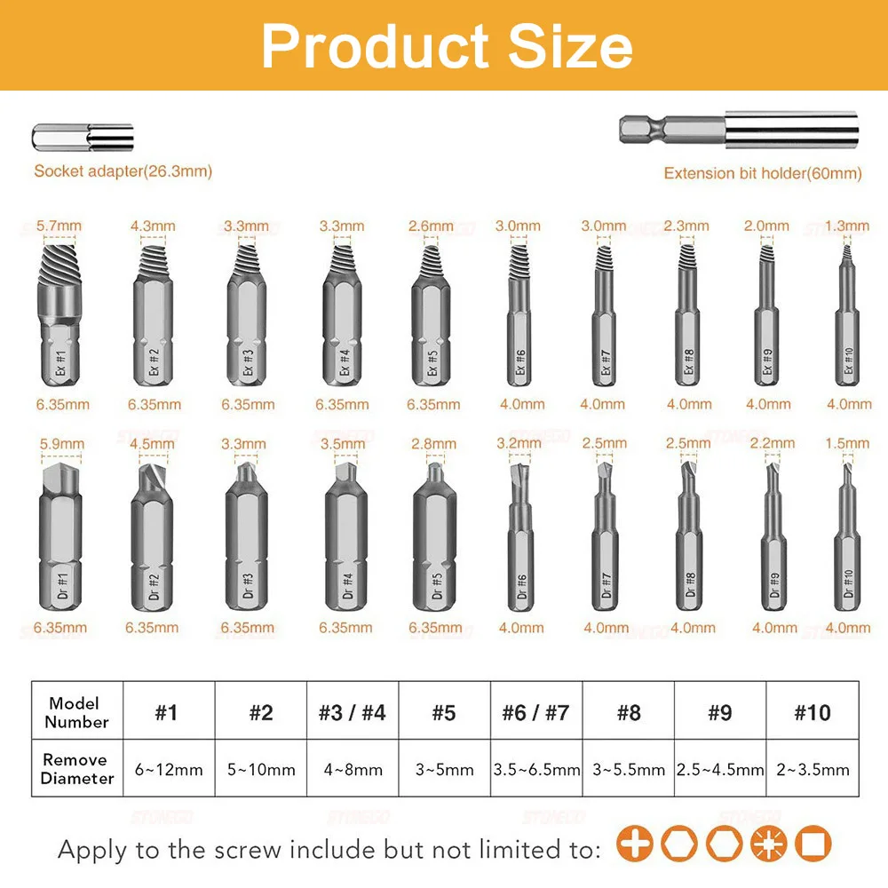 3. The stripped screw extractor kit is includes 20 pieces of stripped screw extractor in 10 different sizes to satisfy all you demand. Suitable for any sizes screw or bolt.