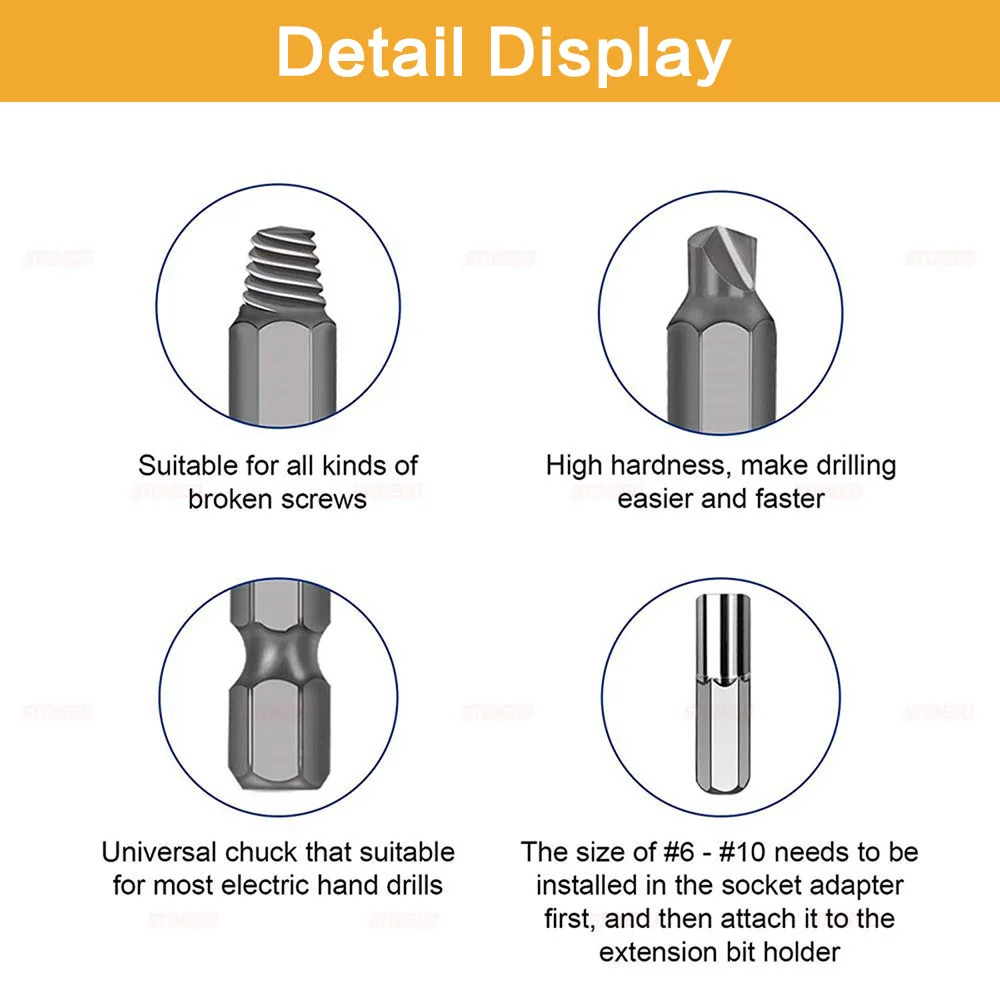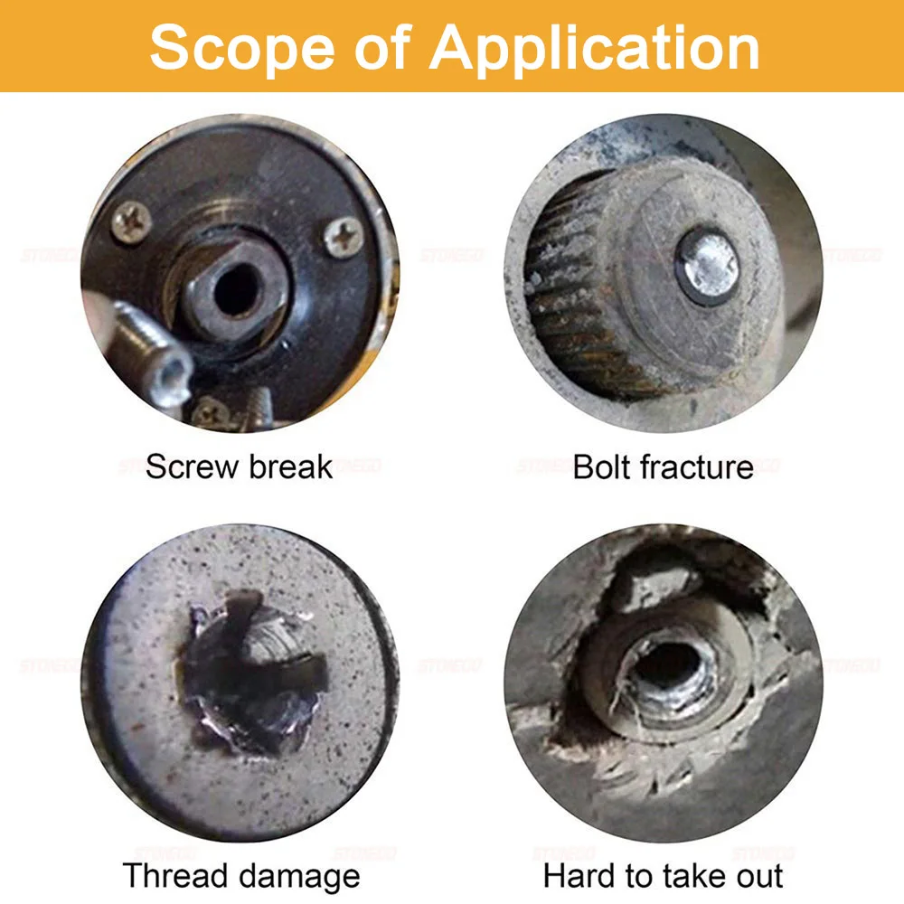1. Screw extractor is made of high quality High-Speed Steel 4241. High hardness, durable and easily remove damaged screws.
