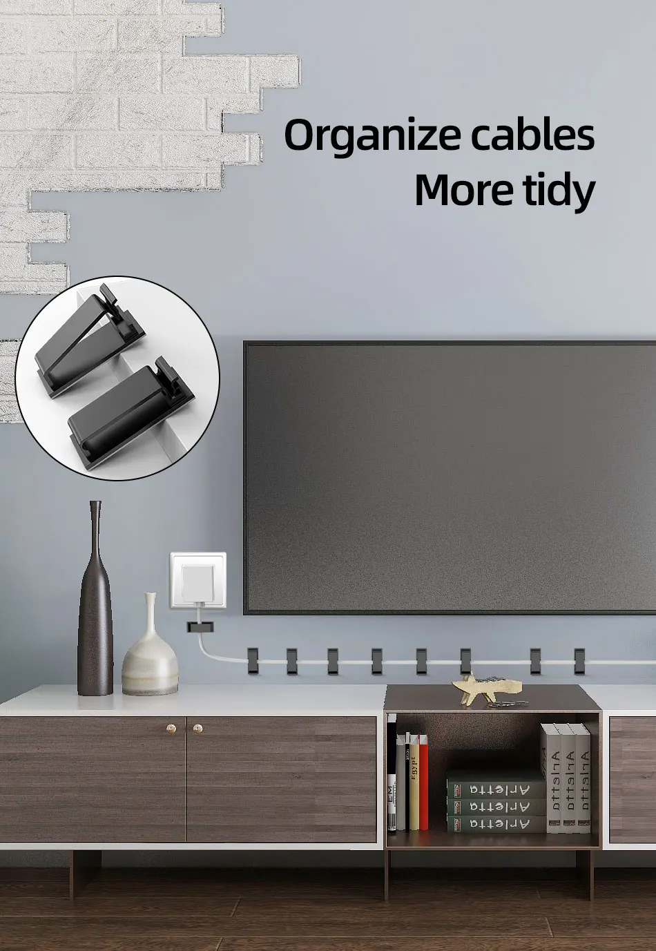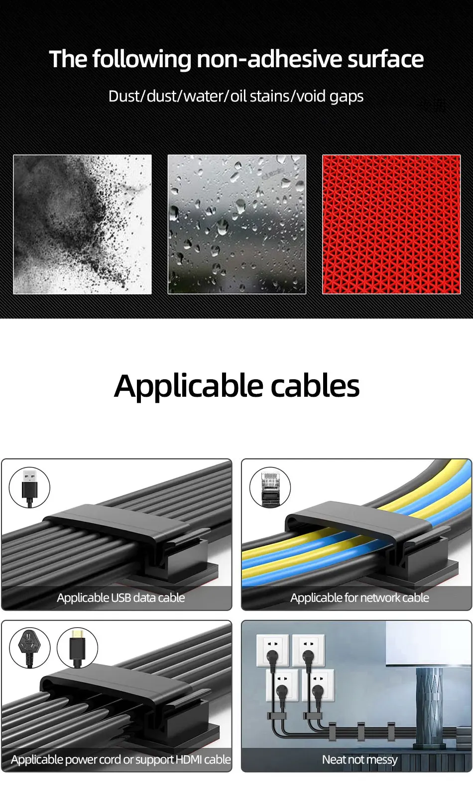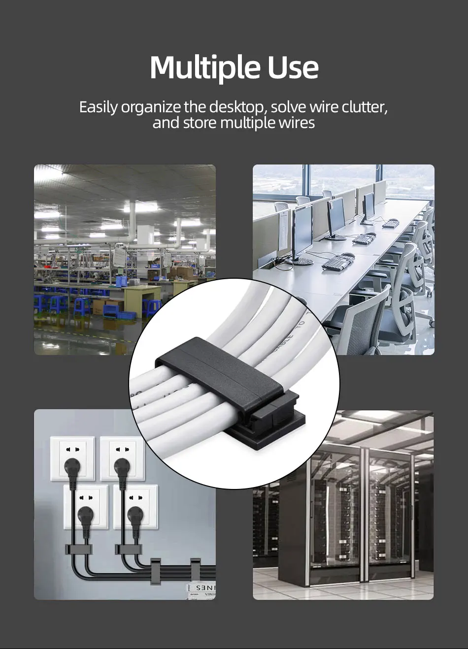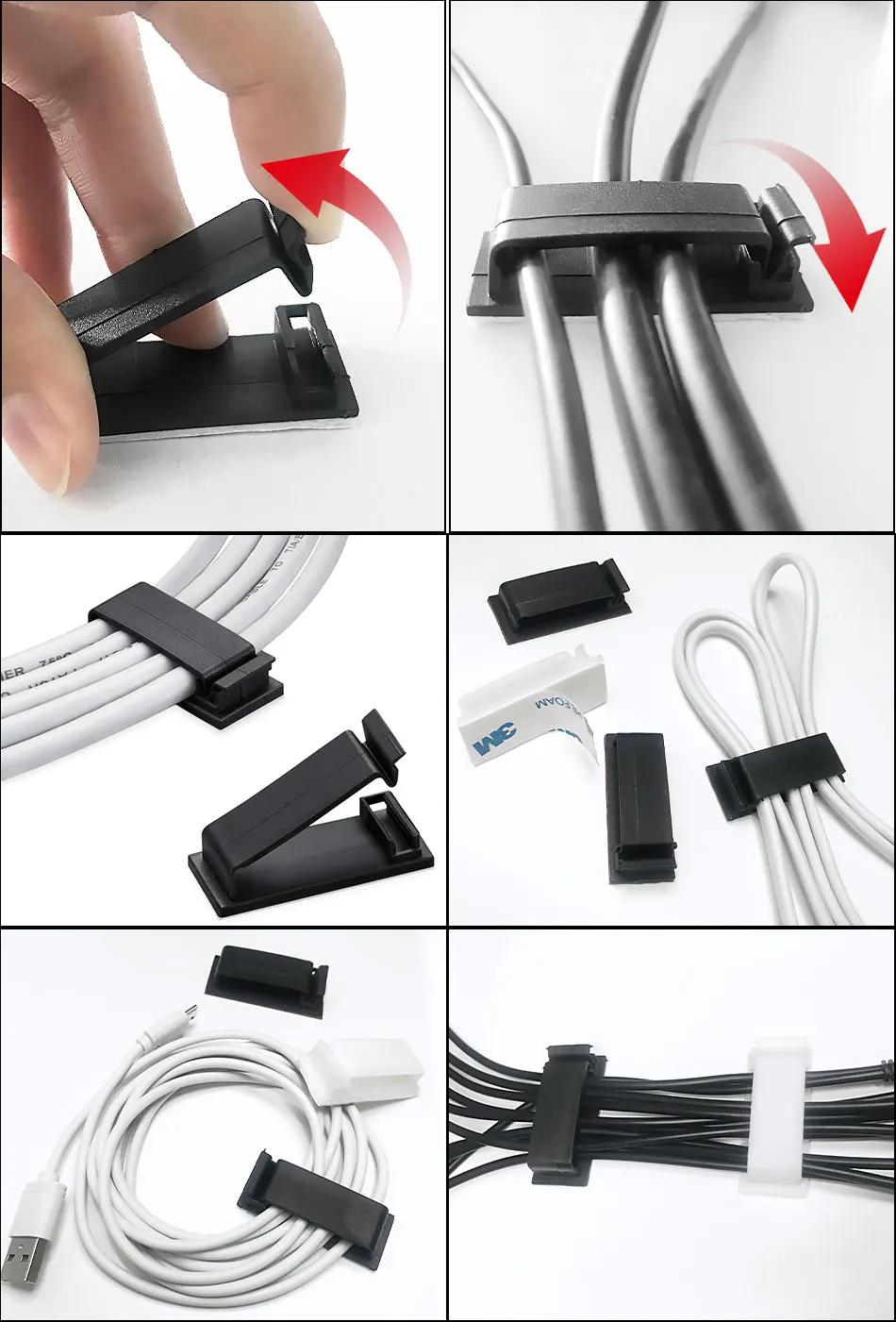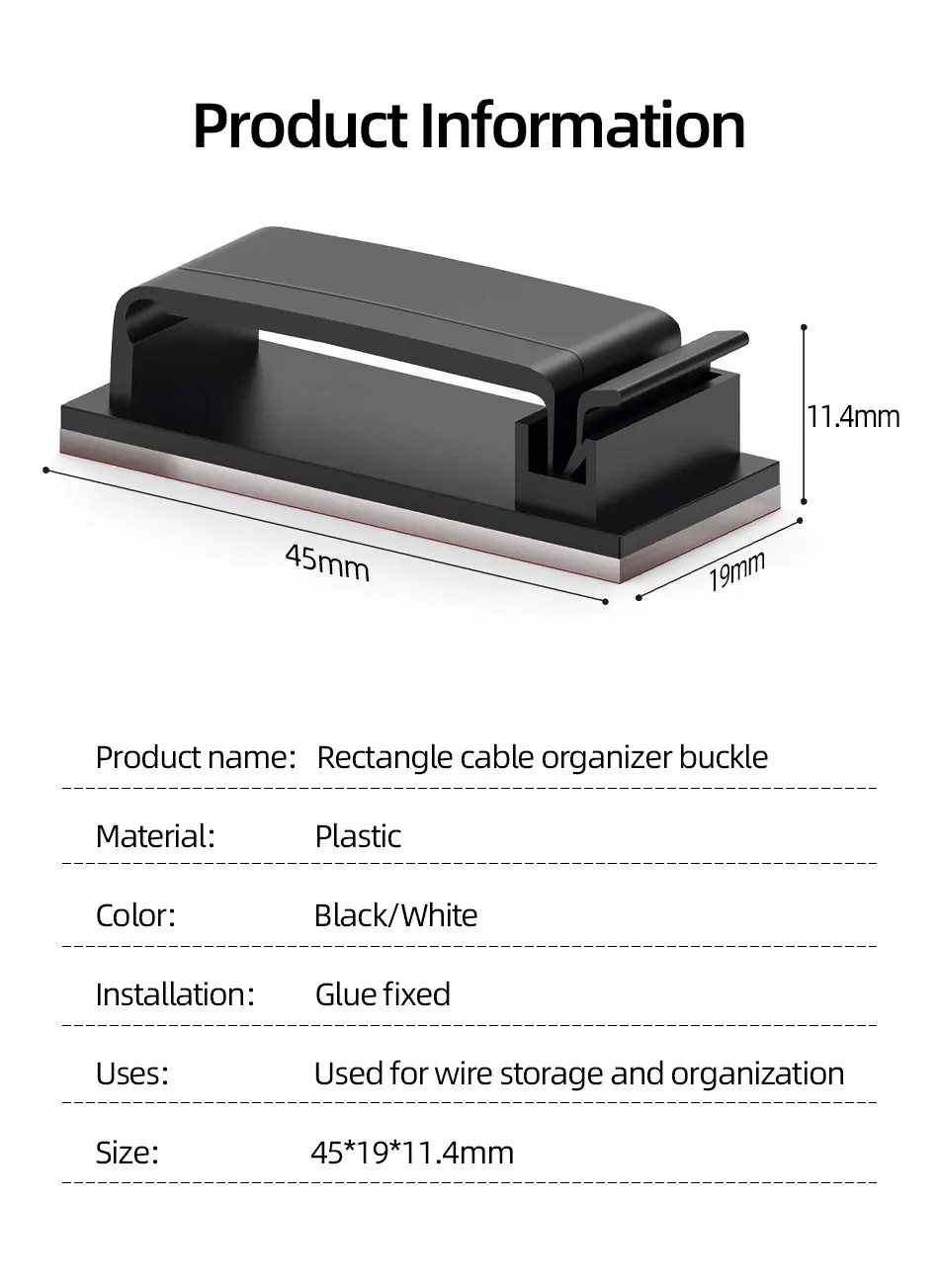 Feature:*Plastic material is strong and durable.*The mini size will not affect the appearance of the desktop while arranging the cables.*Let the messy cables be managed and use more convenient.*Using high-quality adhesive tape, it can be used on glass, wood, ceramic tiles and other materials.Specification:Material: PlasticColor: White