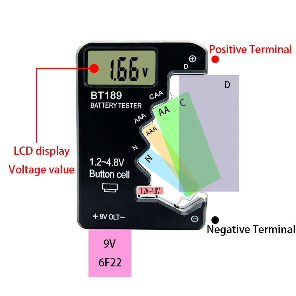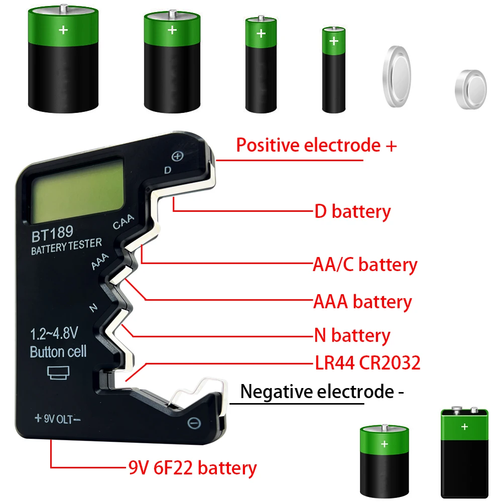 BT189 Digital Battery Tester LCD Display AA/AAA/9V/1.5V Button Cell Battery Capacity Check Detector Capacitance Diagnostic Tool