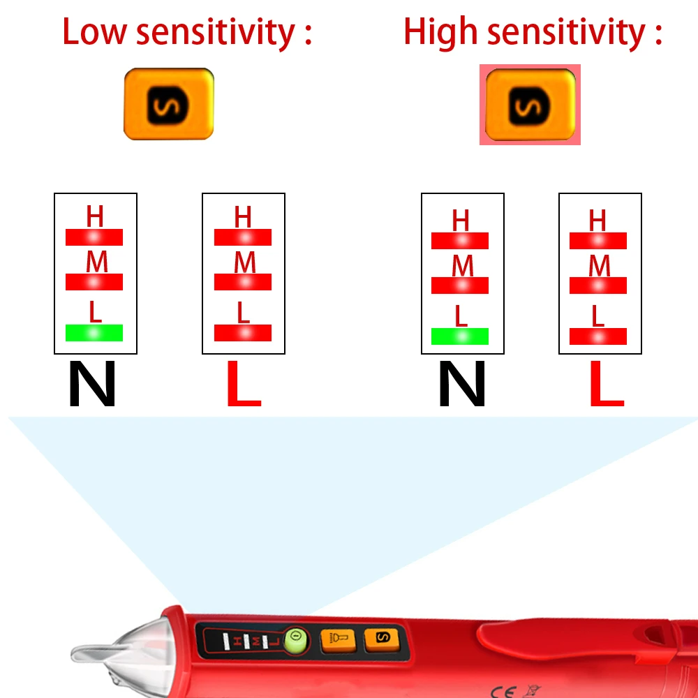 NCD sensitivity indicator light: The tester indicates high/H, medium/M, low/L through different frequency alarm sounds and different color LEDs,