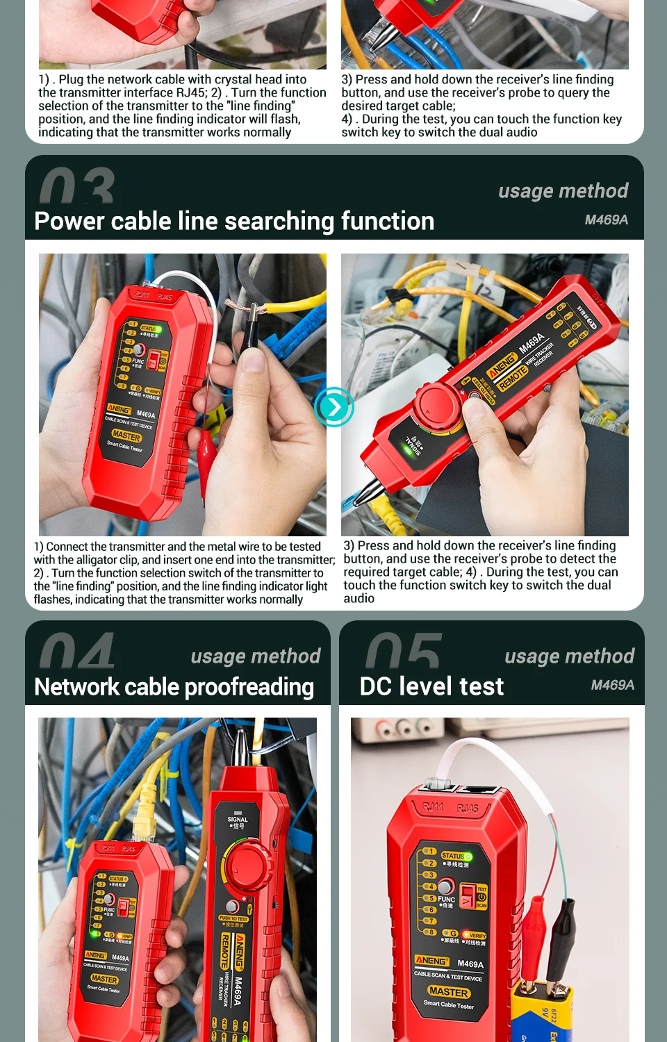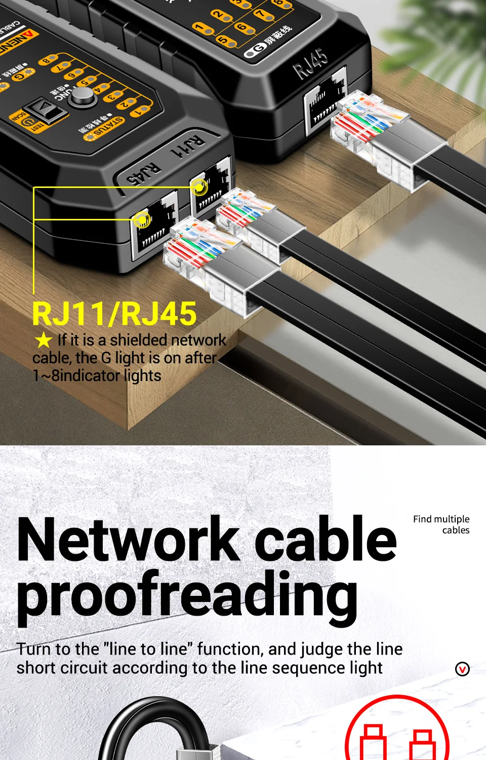 4.During the test,you can touch the "switch"button to switch between fast ans slow.Using automatic scanning method,fast test,test the twisted pair 1,2,3,4,5,6,7,8,G by root(pair),and can distinguish which one (pair)out of order,short circuit,and open circuit,ect.