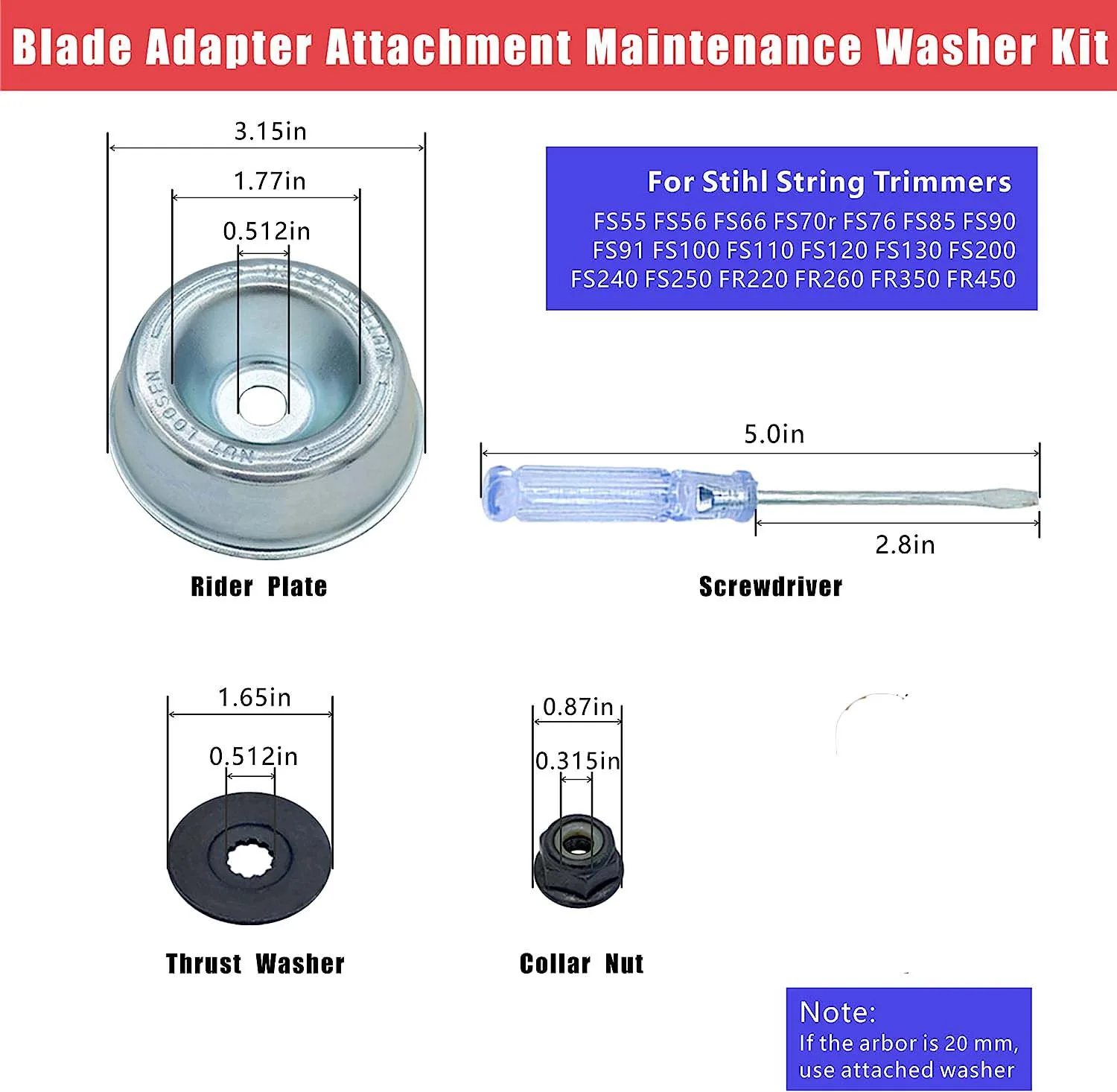 The First Kit: blade adapter attachment maintenance washer kit contains: 1 x Thrust Washer(10 teeth)/ 1 x Rider Plate/ 1 x Collar Nut(m10x1.0)/ 1 x Screwdriver. The Second Kit: blade trimmer head adapter kit: 1 x Thrust plate guard washer (6 teeth)/ 1 x Thrust washer/ 1 x Rider plate/ 1 x Lock nut(m10x1.25)