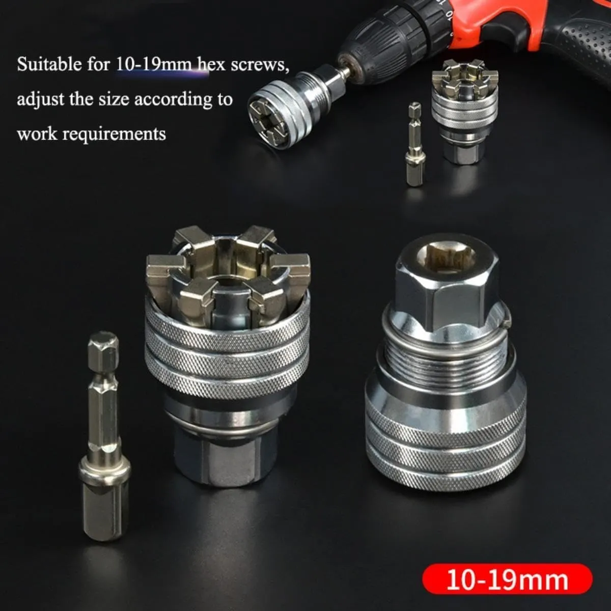 WIDE ADJUSTABILITY SOCKET WRENCH SET: Replaces over 30 sockets from 3/8" to 3/4" and 10 to 19 mm. Special self-adjustment of this universal sockets can fit any size or shapes. Adjusted immediately to grasp most nuts, screws, hooks, lag screws, bolt heads and other odd shape fasteners that you don't have the right tool for.