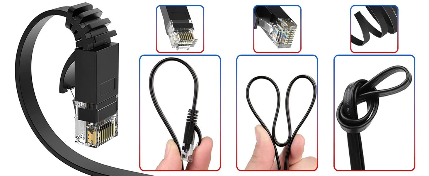 The Flat Ethernet cables are super flexible and much easier to manage when run under the carpet, doors, rotating arms and drawers or along walls. The flat design helps avoid tangled cords and saves space.
